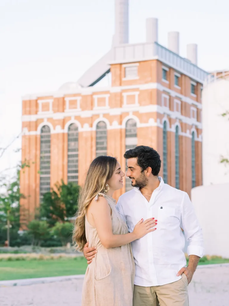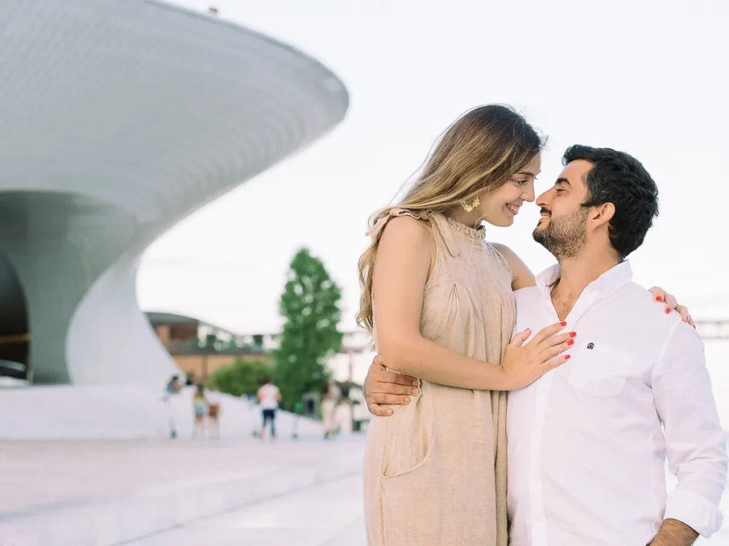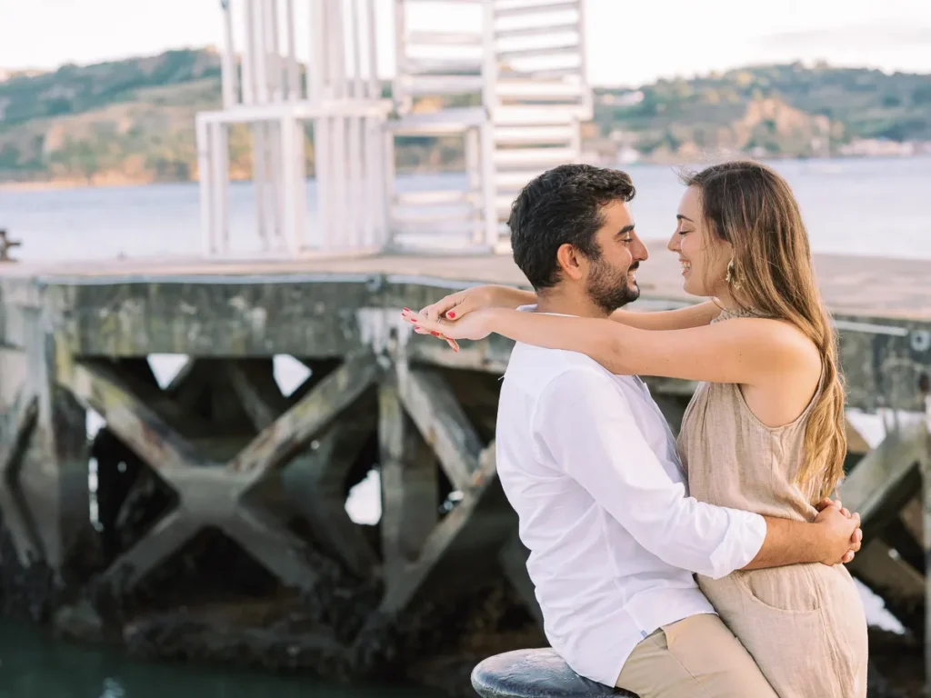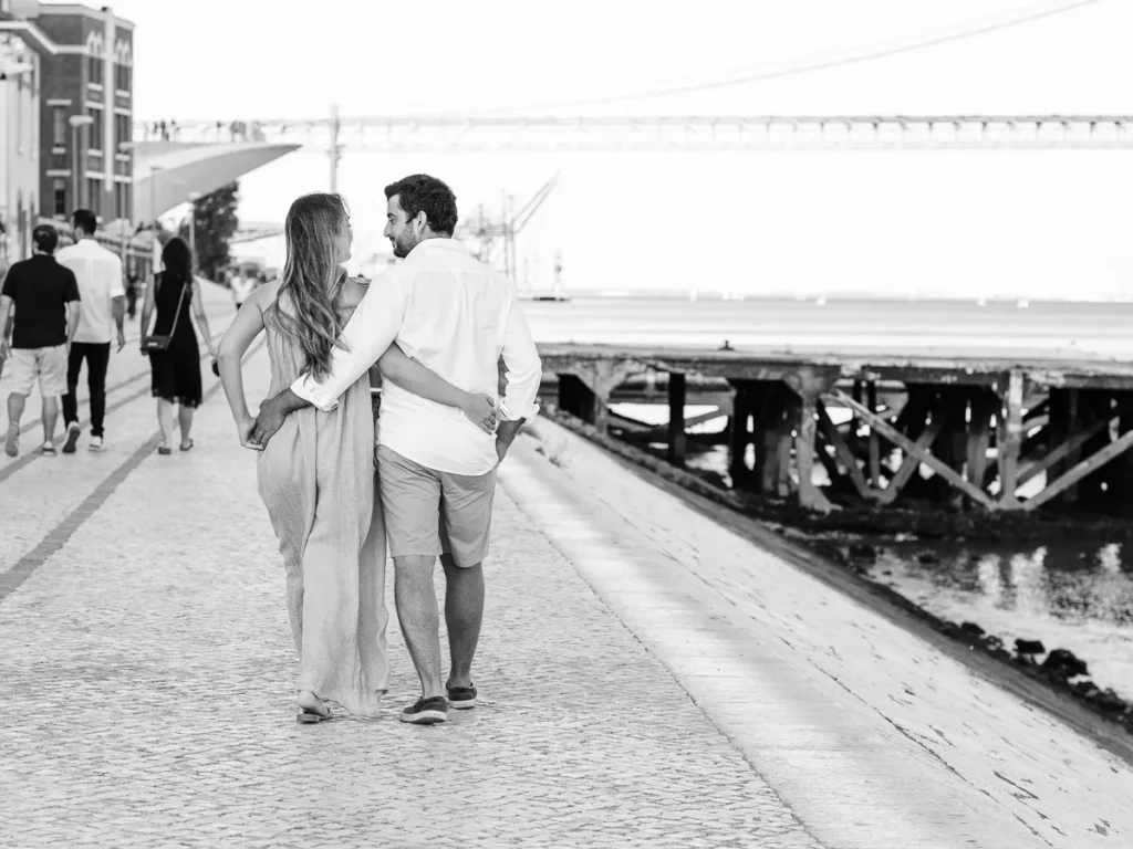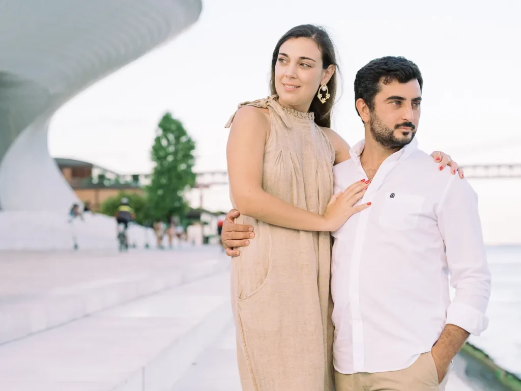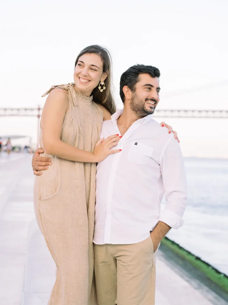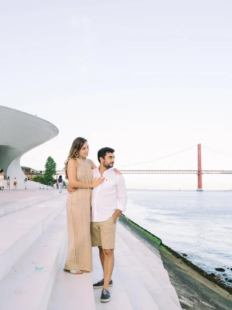 À medida que o sol ia descendo, fomos em busca daquela luz absolutamente incrível que só a cidade de Lisboa consegue oferecer. Descemos até à zona ribeirinha de Belém, mesmo de frente para o Rio Tejo. Com uma vibe fantástica e um romantismo palpável, aproveitámos os últimos raios da golden hour. A química inegável do João e da Catarina, aliada ao brilho do rio, resultou em fotografias fine art de uma beleza crua e inesquecível.