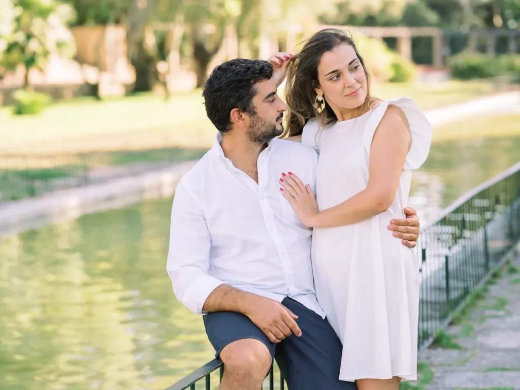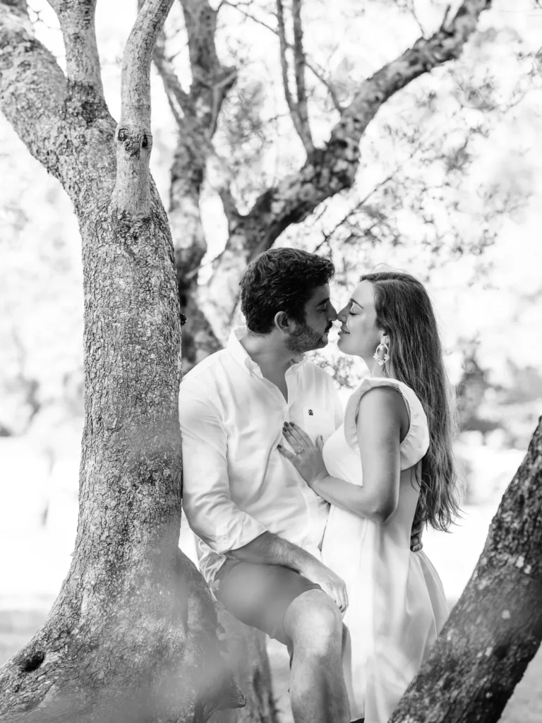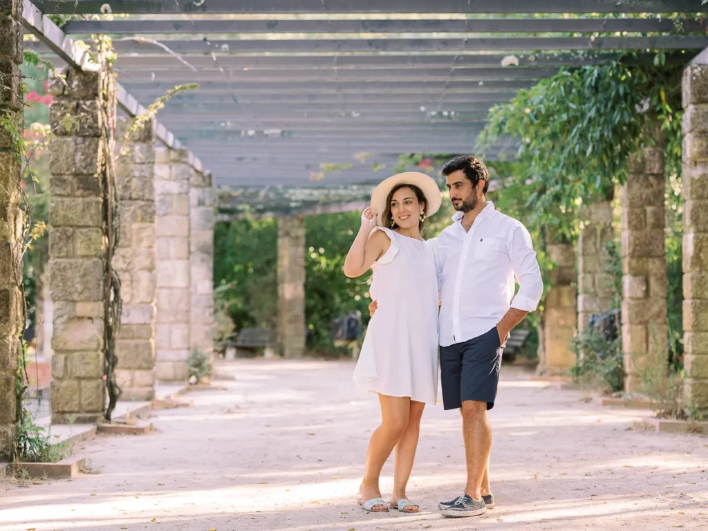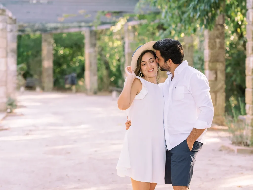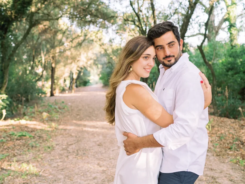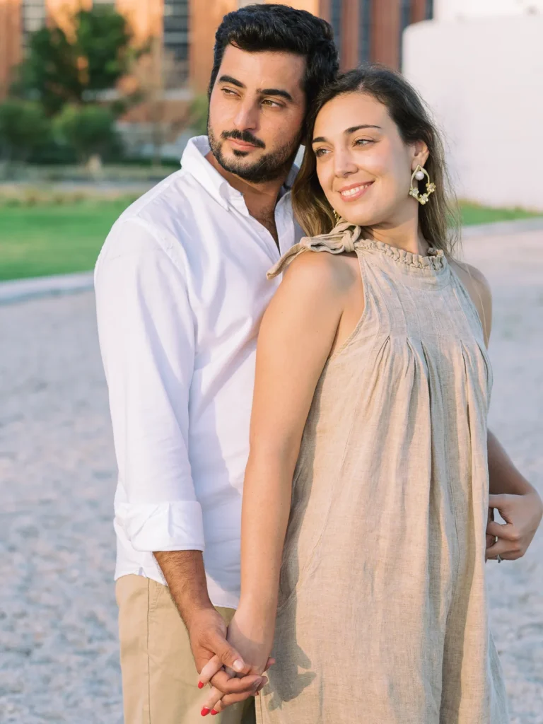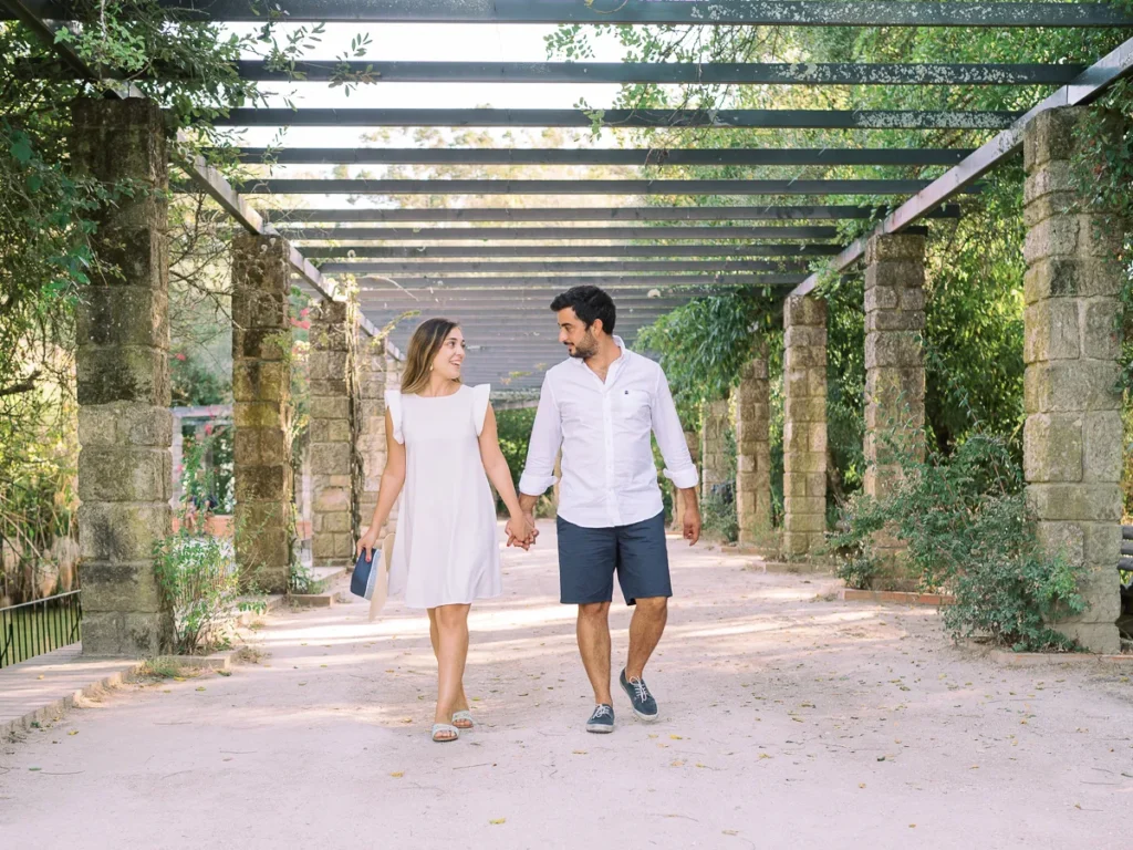 O ponto de partida para este final de tarde descontraído foi o pulmão verde de Lisboa: o Parque Florestal de Monsanto. Mais concretamente, a envolvência clássica e serena do Jardim dos Montes Claros. Entre passeios lentos e conversas soltas, fomos quebrando o gelo e registando a cumplicidade orgânica do casal. Sem poses forçadas, apenas a fluidez documental que nos caracteriza, abraçada pela natureza.