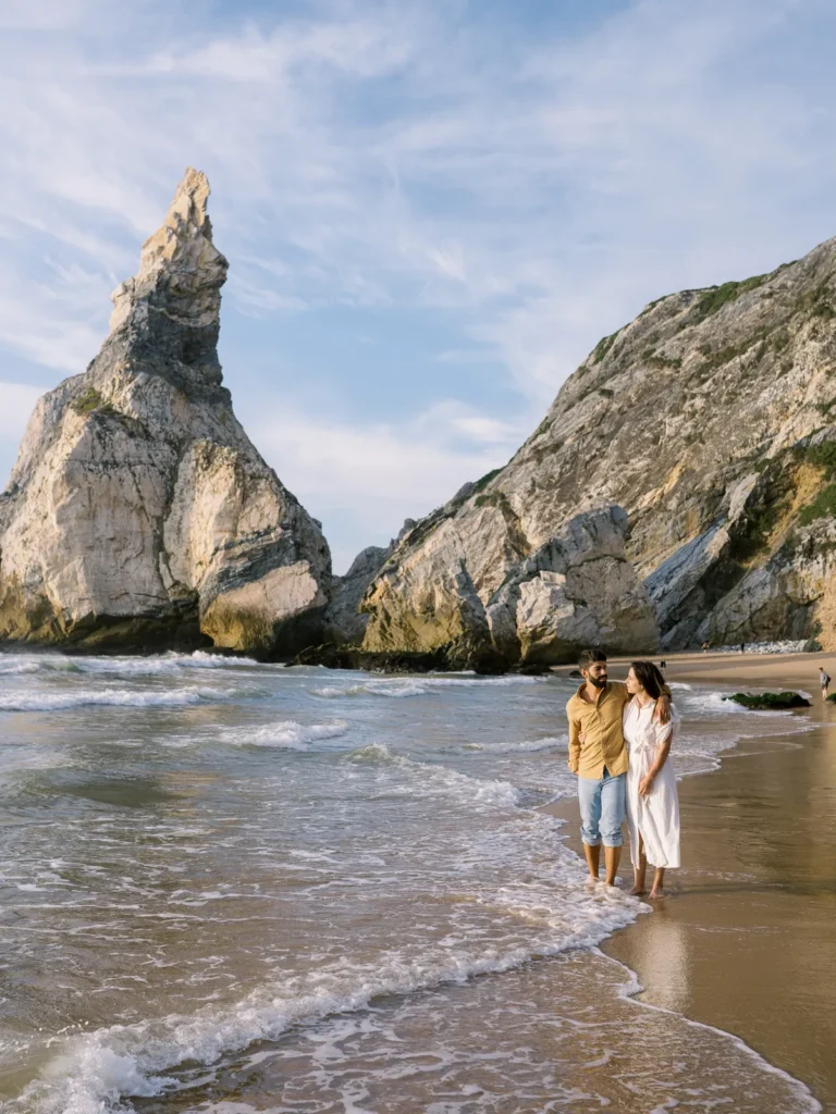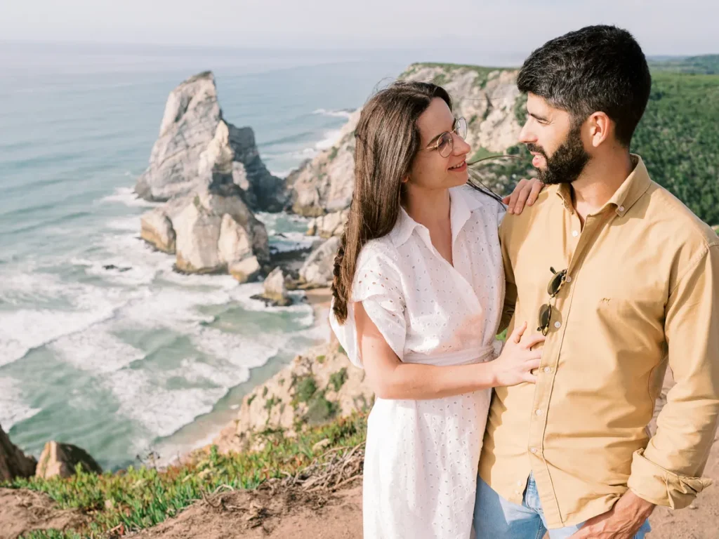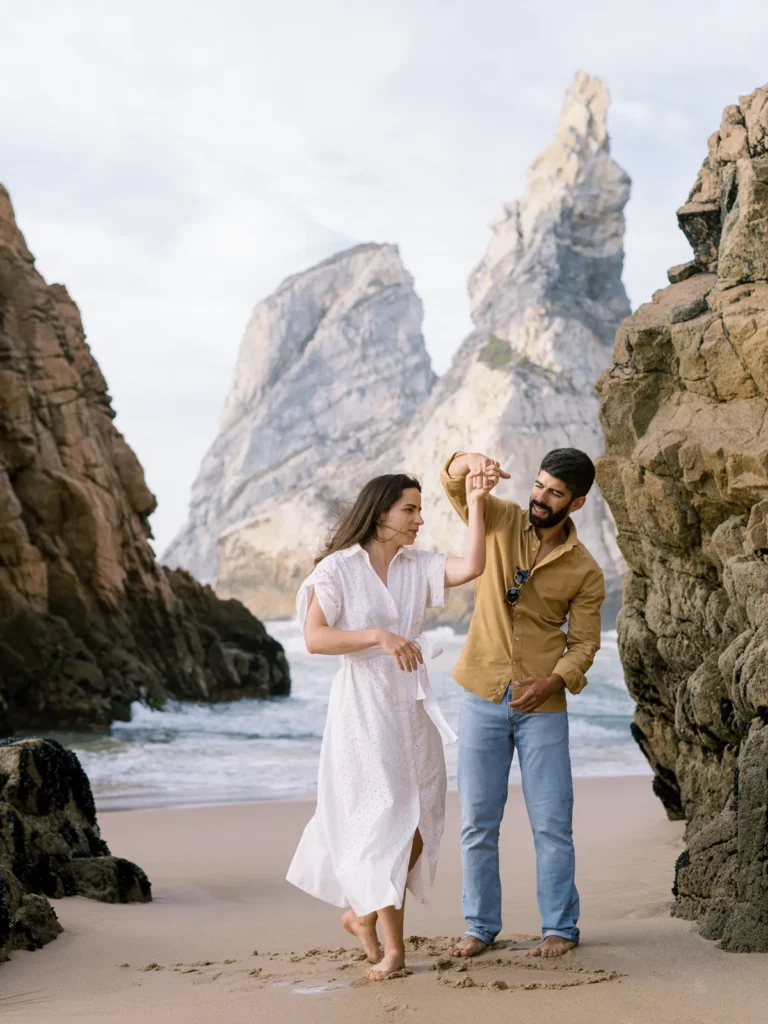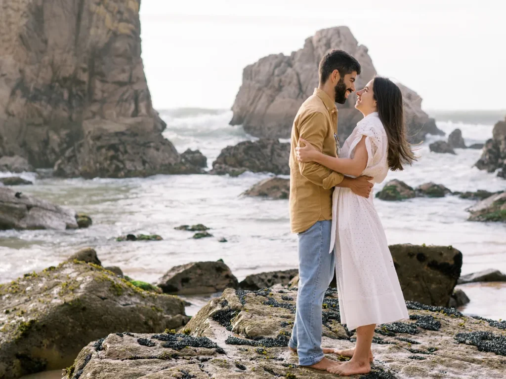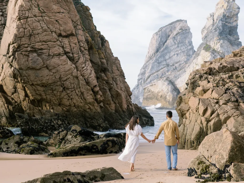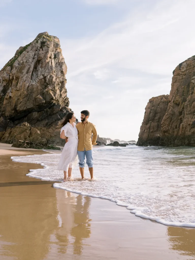 Descer até à Praia da Ursa é, por si só, uma aventura que exige espírito livre e vontade de explorar. E foi exatamente essa entrega que este casal nos ofereceu! Ao pisarmos o areal desta praia idílica, fomos brindados com um cenário de cortar a respiração: um refúgio quase deserto, protegido por falésias dramáticas e pontuado pelos icónicos rochedos no mar. Um autêntico paraíso intocado, perfeito para a nossa estética fine art e orgânica.