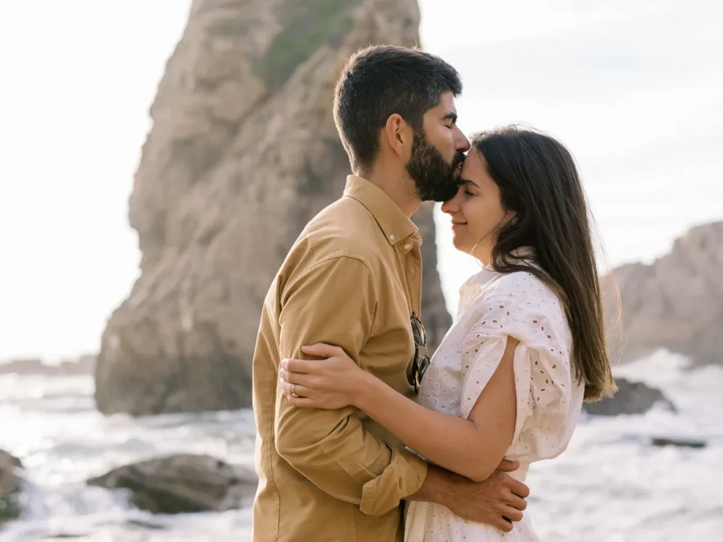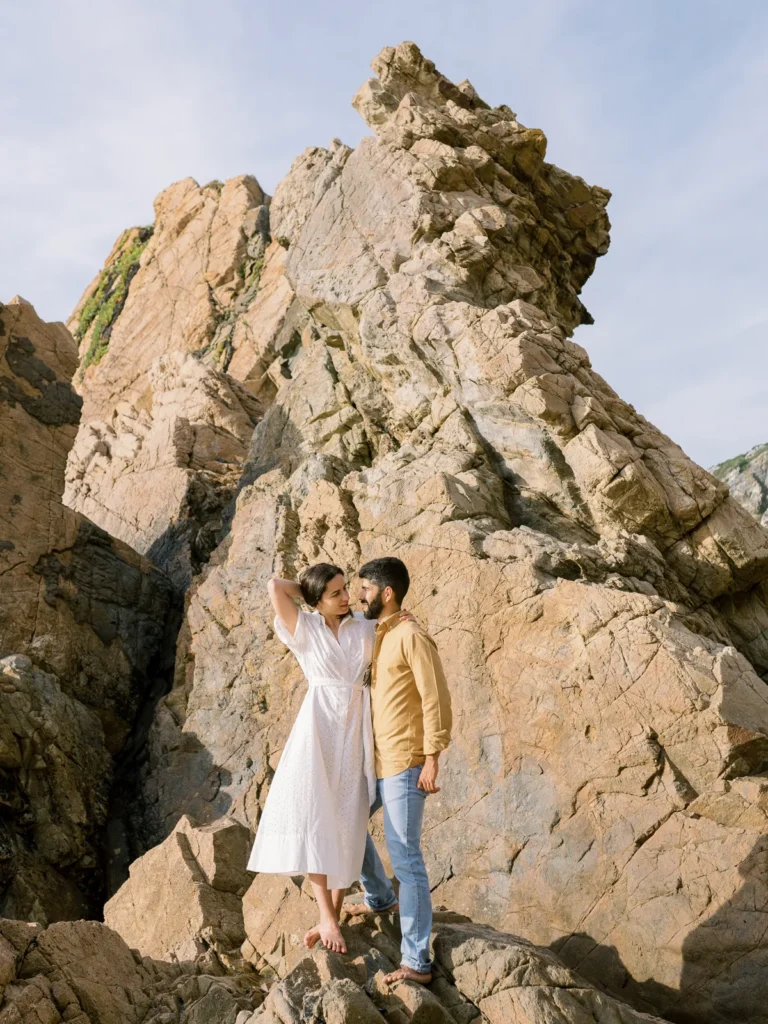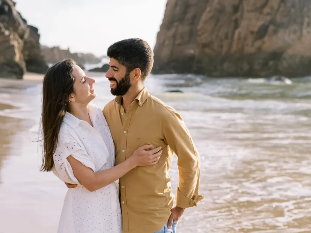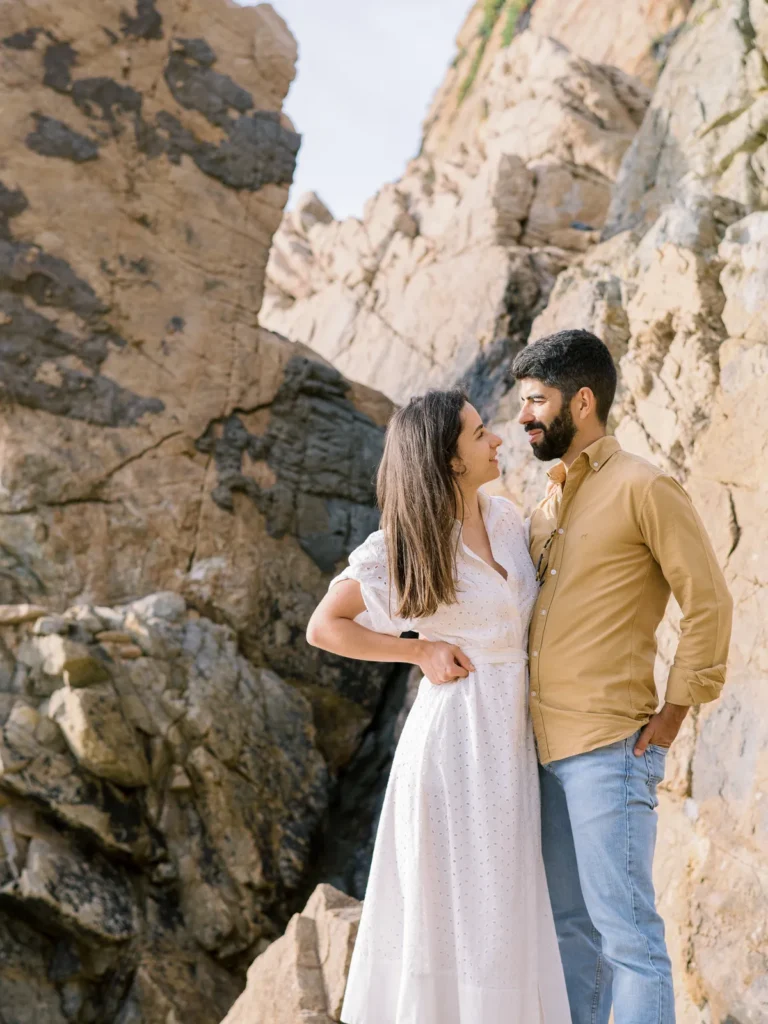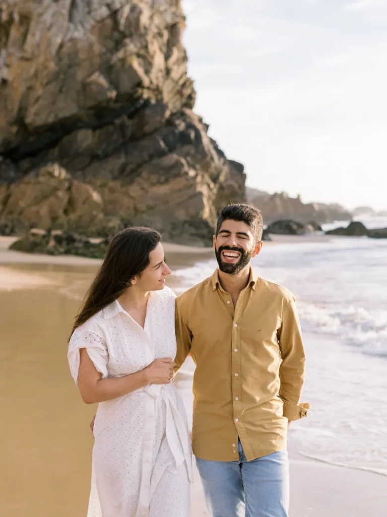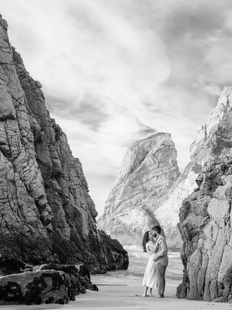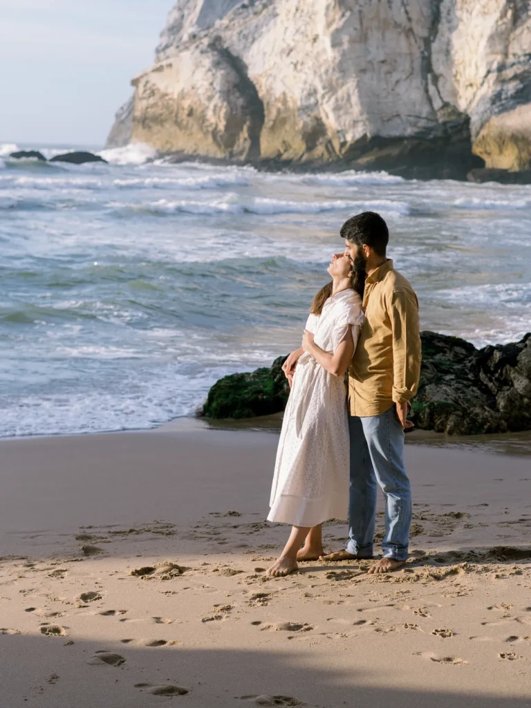 Descer até à Praia da Ursa é, por si só, uma aventura que exige espírito livre e vontade de explorar. E foi exatamente essa entrega que este casal nos ofereceu! Ao pisarmos o areal desta praia idílica, fomos brindados com um cenário de cortar a respiração: um refúgio quase deserto, protegido por falésias dramáticas e pontuado pelos icónicos rochedos no mar. Um autêntico paraíso intocado, perfeito para a nossa estética fine art e orgânica.