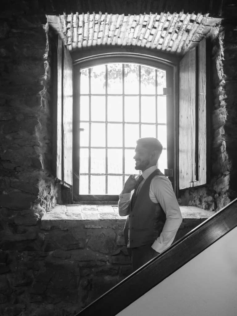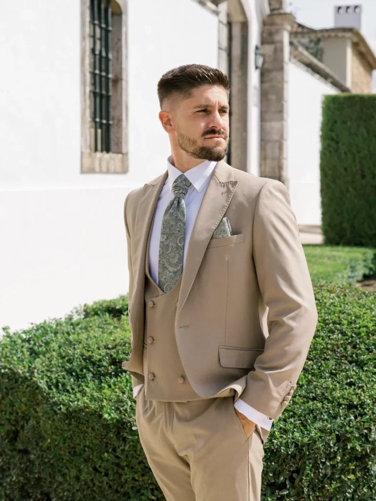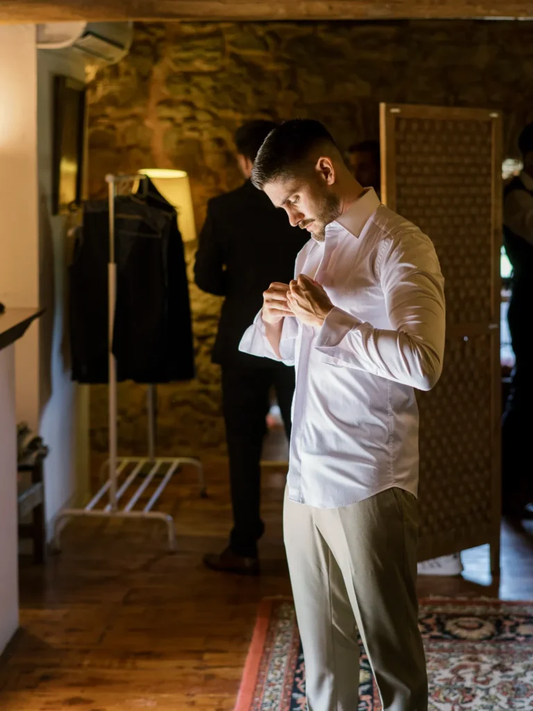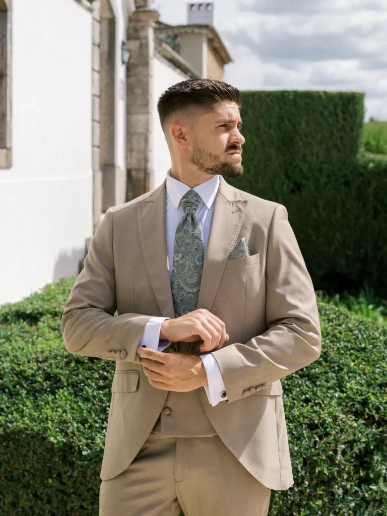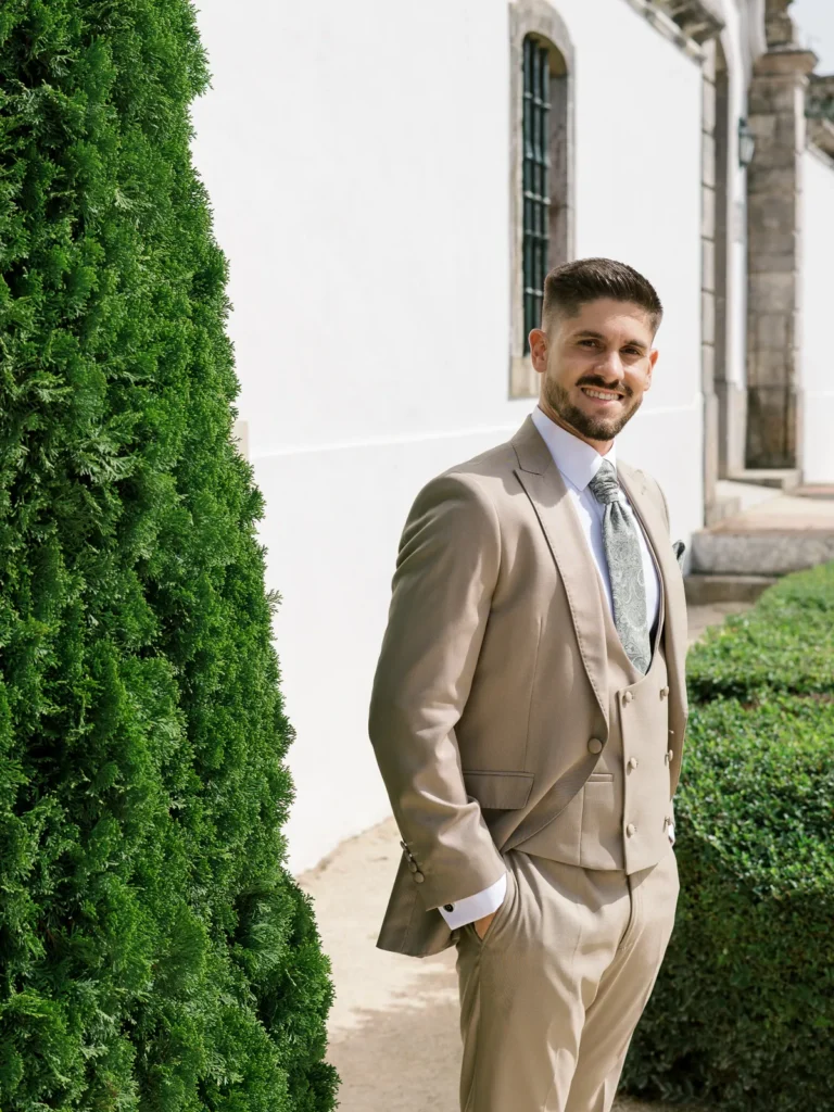 O Diogo partilhou da mesma vibe descontraída. A sua preparação começou no mezanino do salão principal da quinta — um espaço com sombras que dão um caráter incrível à fotografia, mas o dia convidou-nos a vir um pouco ao exterior. Entre conversas e sorrisos, captámos a sua essência de forma genuína.