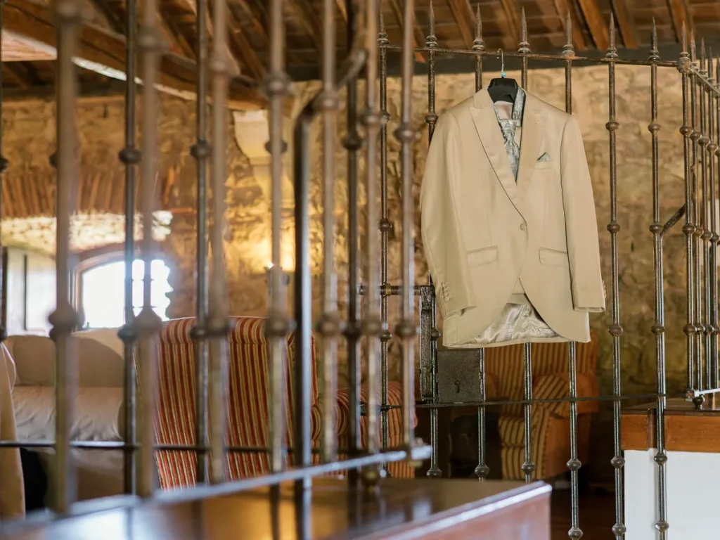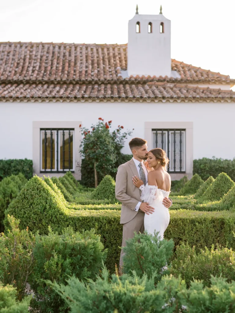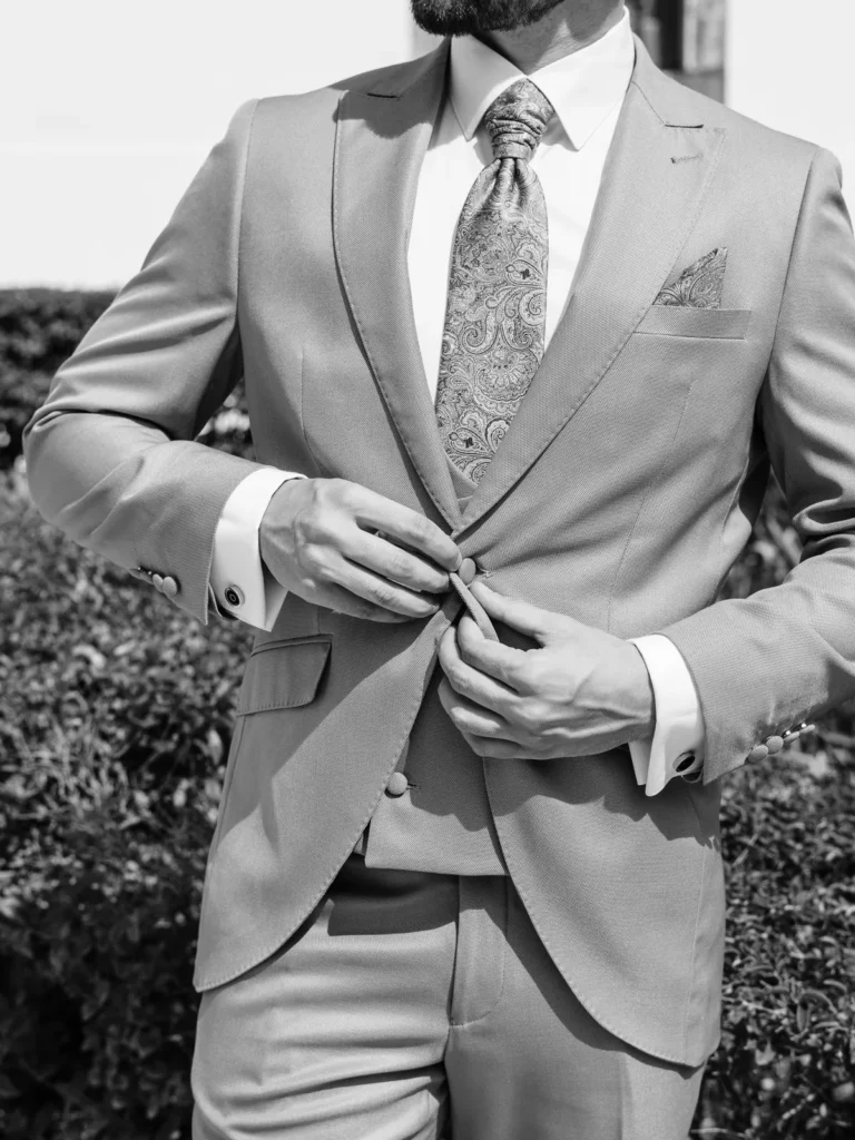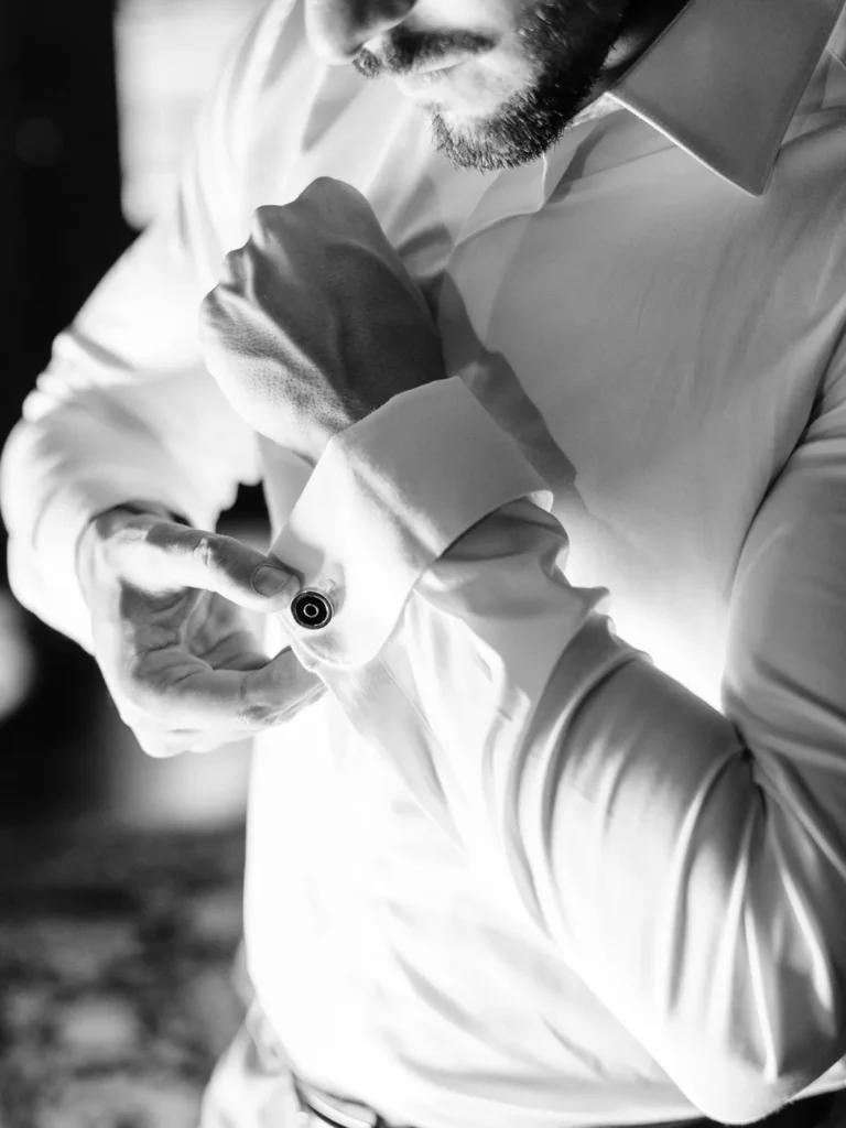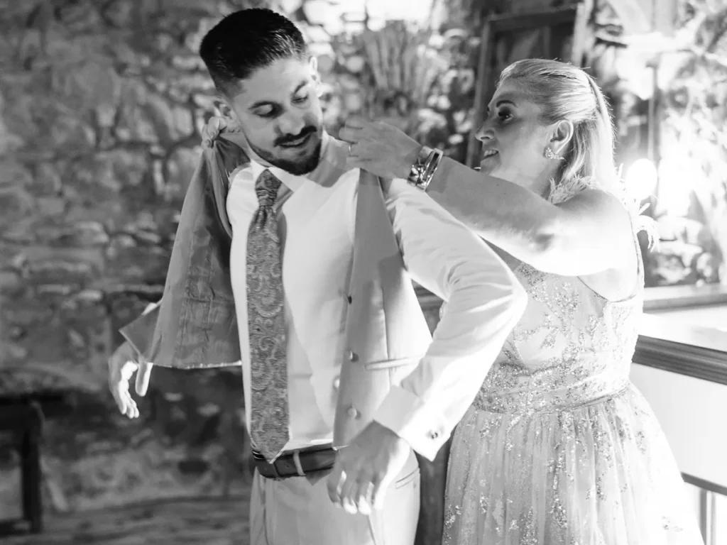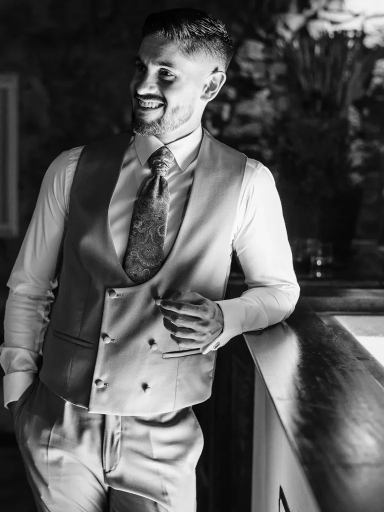 O Diogo partilhou da mesma vibe descontraída. A sua preparação começou no mezanino do salão principal da quinta — um espaço com sombras que dão um caráter incrível à fotografia, mas o dia convidou-nos a vir um pouco ao exterior. Entre conversas e sorrisos, captámos a sua essência de forma genuína.