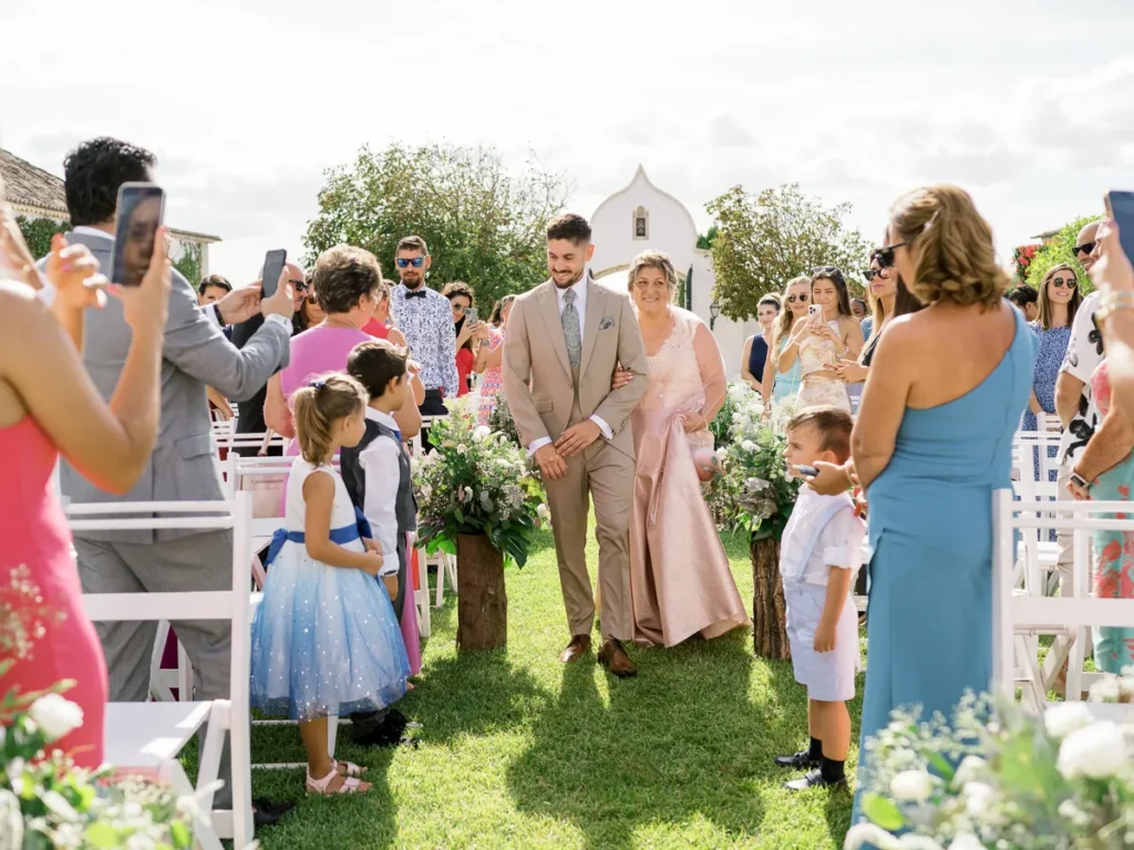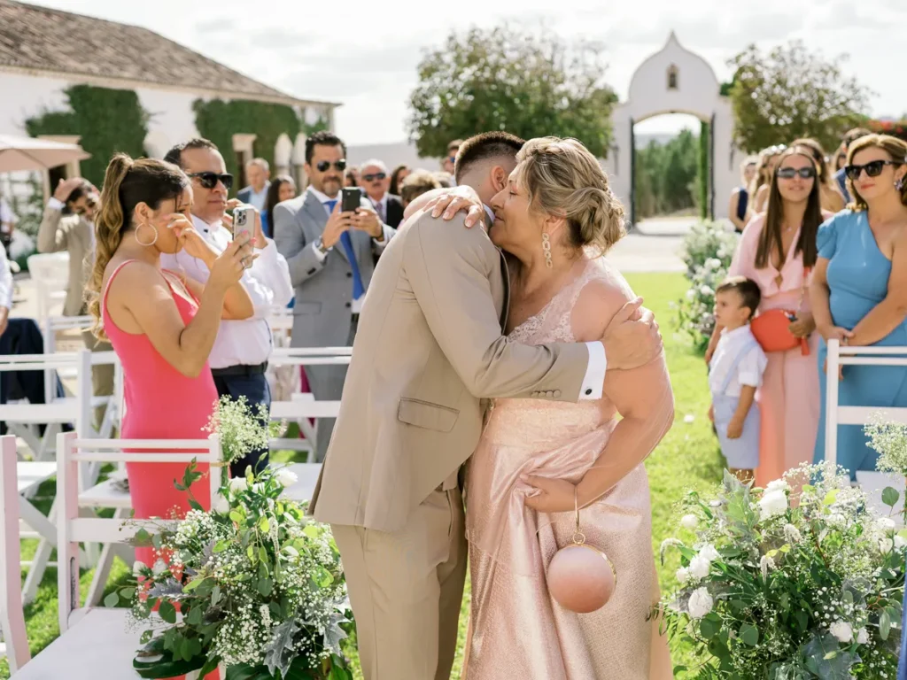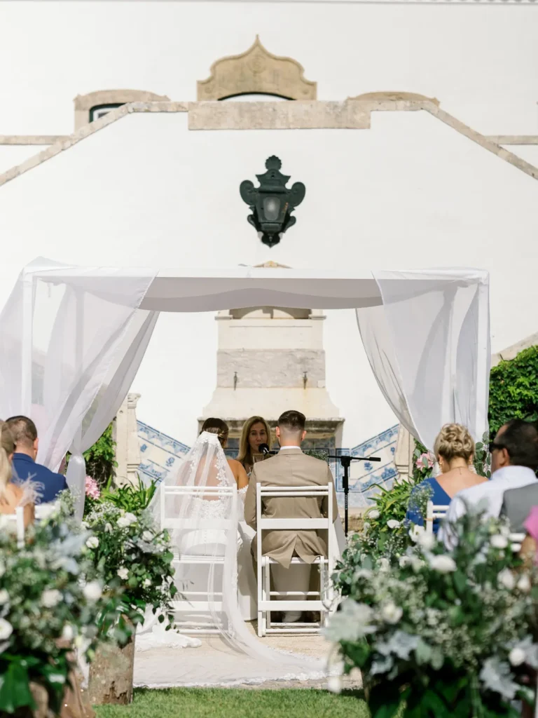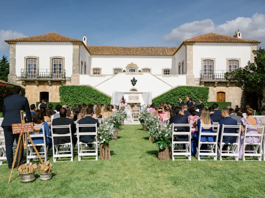 A cerimónia civil decorreu no icónico pátio principal da quinta, criando uma envolvência arquitetónica e emocional incrível. Rodeados pelas paredes com história e abraçados pelos convidados, a Joana e o Diogo trocaram promessas num ambiente acolhedor. O nosso foco esteve em documentar as reações verdadeiras, os olhares cúmplices e a alegria daquele instante.
