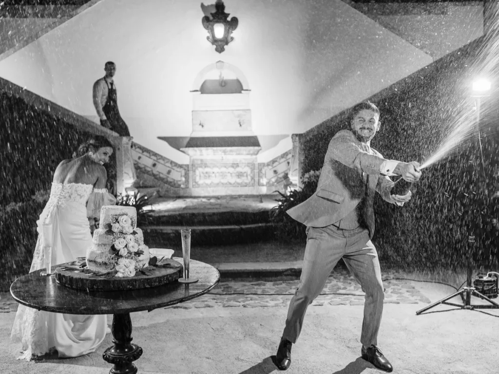 O noivo Diogo a dar um banho de champanhe super animado aos convidados durante o corte do bolo de casamento em Alenquer.