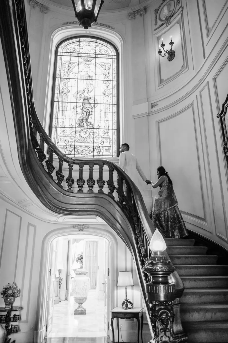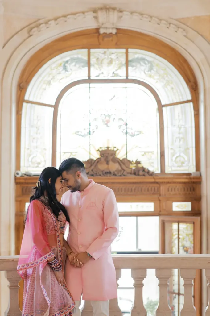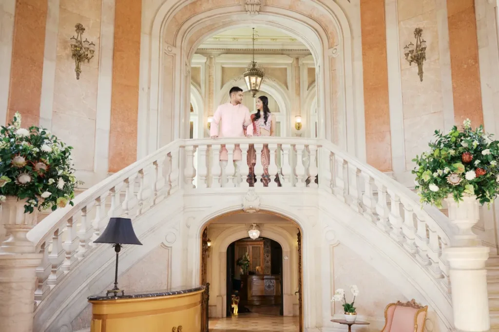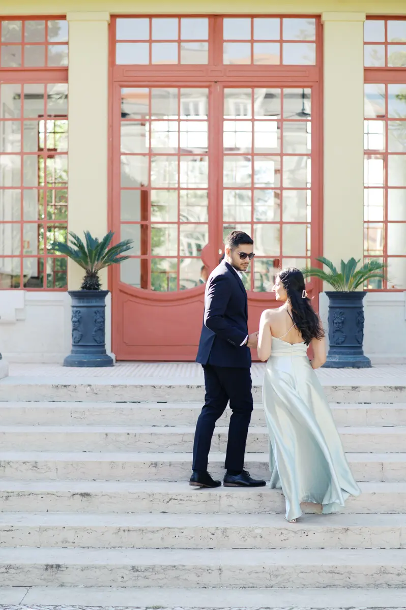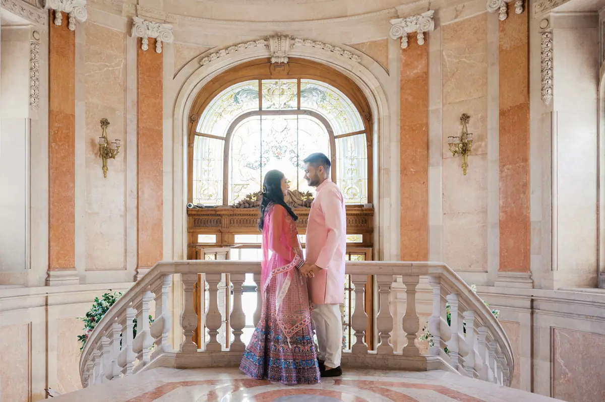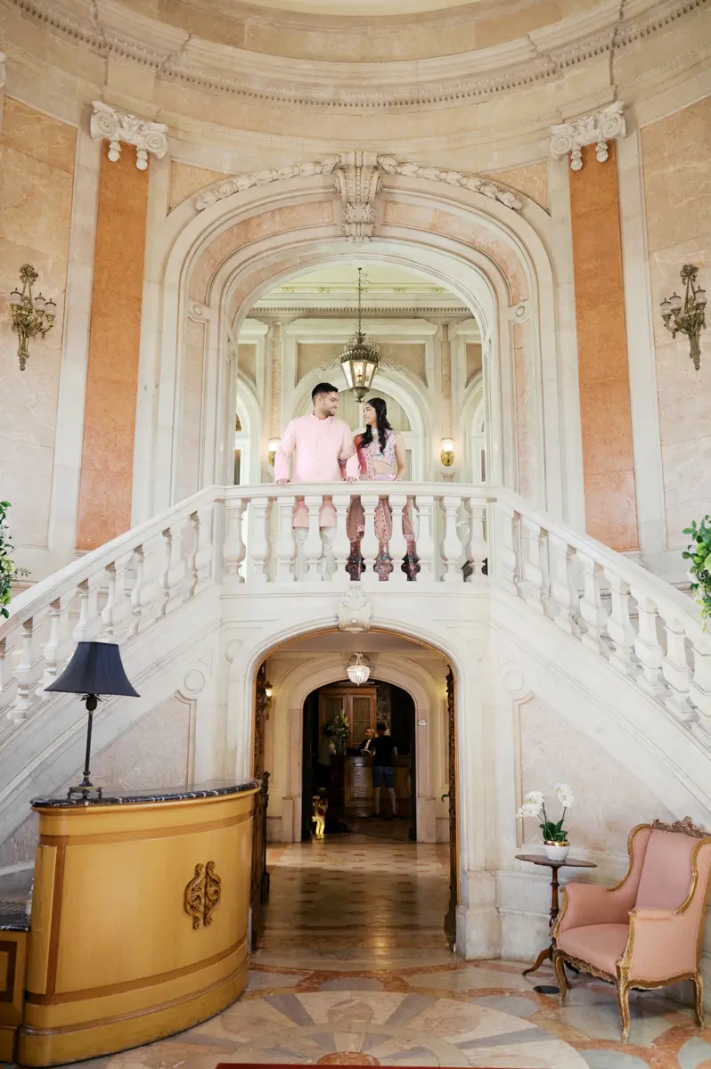 Começámos a nossa sessão nos interiores deslumbrantes do Pestana Palace Lisboa Hotel. A Karishma e o Shivam vestiram os seus lindíssimos trajes tradicionais indianos em tons vibrantes de cor-de-rosa. Esta escolha de paleta não podia ter sido mais perfeita: fundiu-se de forma magistral com a arquitetura clássica, os frescos e o luxo do hotel. Conseguimos uma estética puramente editorial, mas onde a boa disposição e a química do casal roubaram completamente a cena.