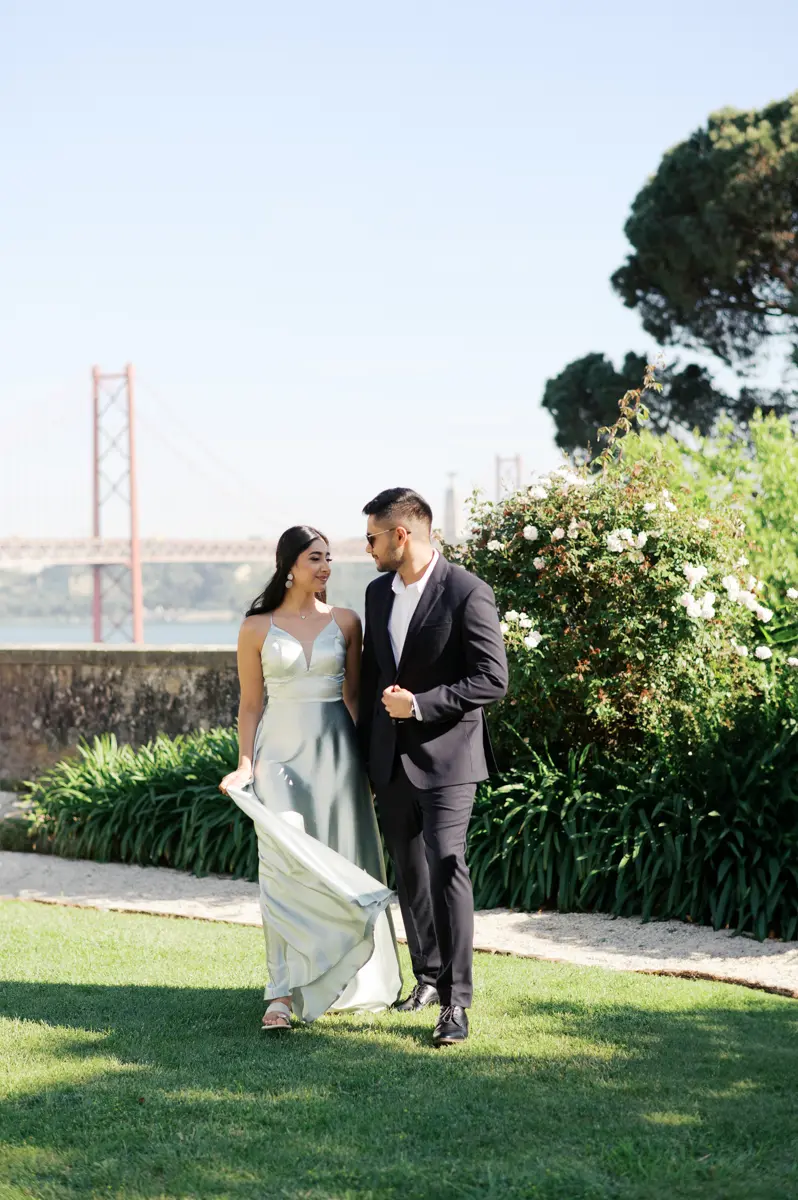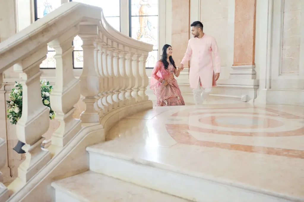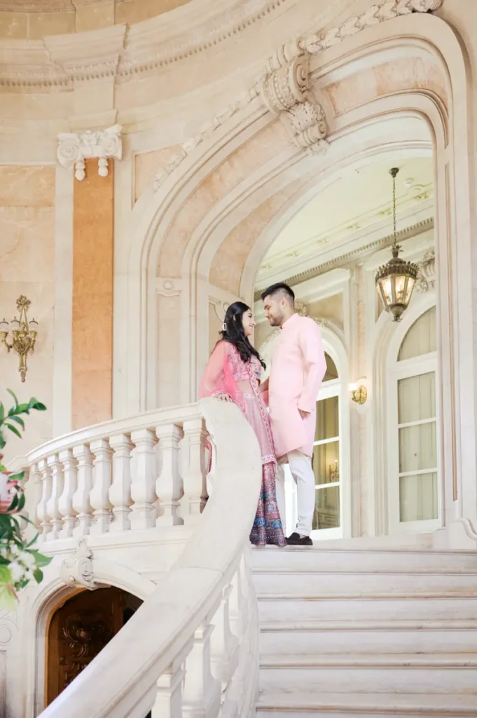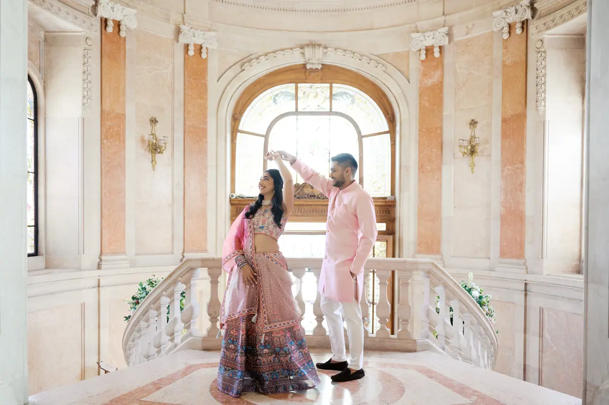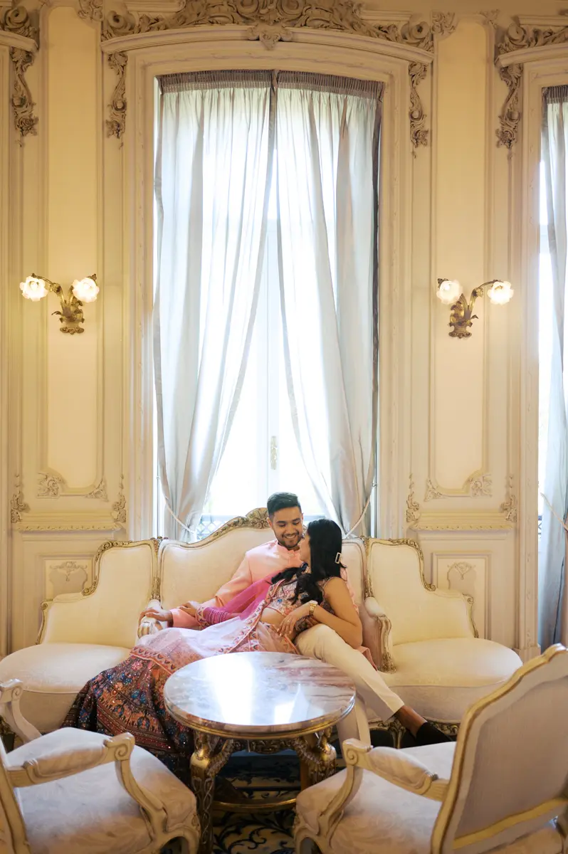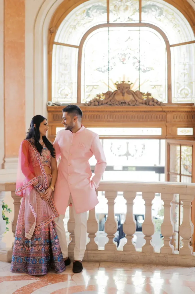 Começámos a nossa sessão nos interiores deslumbrantes do Pestana Palace Lisboa Hotel. A Karishma e o Shivam vestiram os seus lindíssimos trajes tradicionais indianos em tons vibrantes de cor-de-rosa. Esta escolha de paleta não podia ter sido mais perfeita: fundiu-se de forma magistral com a arquitetura clássica, os frescos e o luxo do hotel. Conseguimos uma estética puramente editorial, mas onde a boa disposição e a química do casal roubaram completamente a cena.