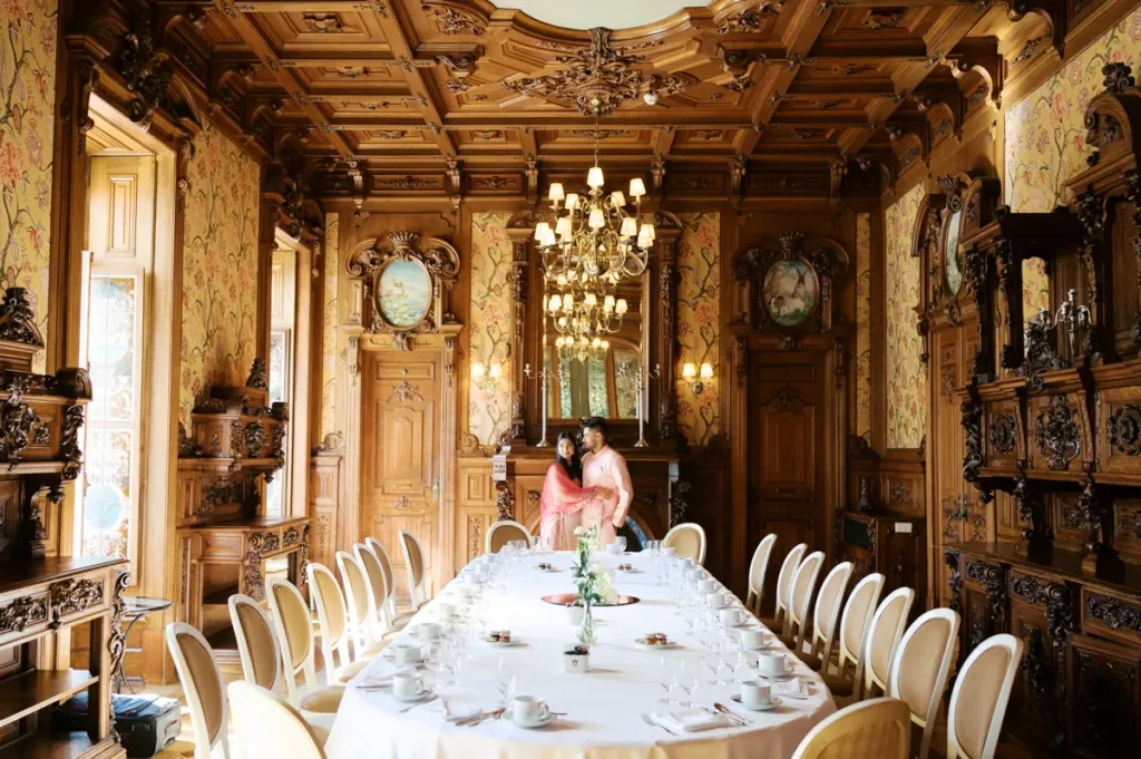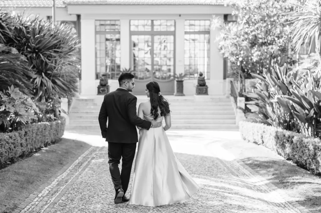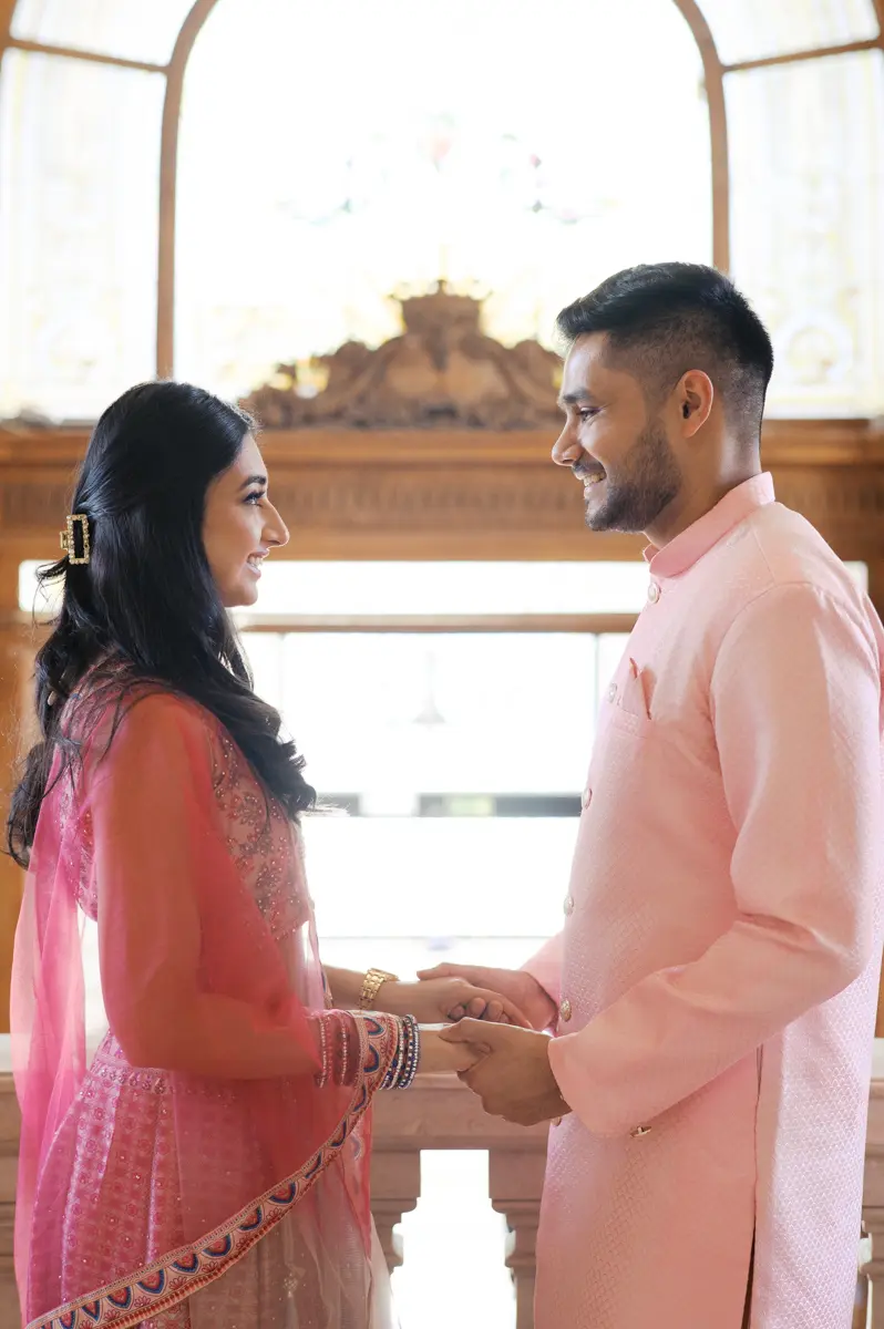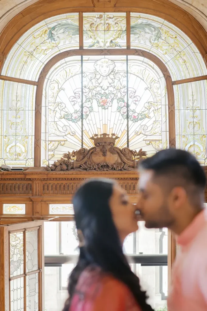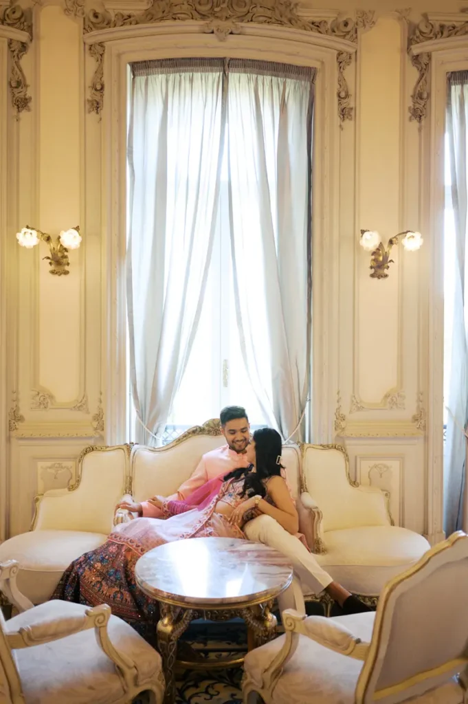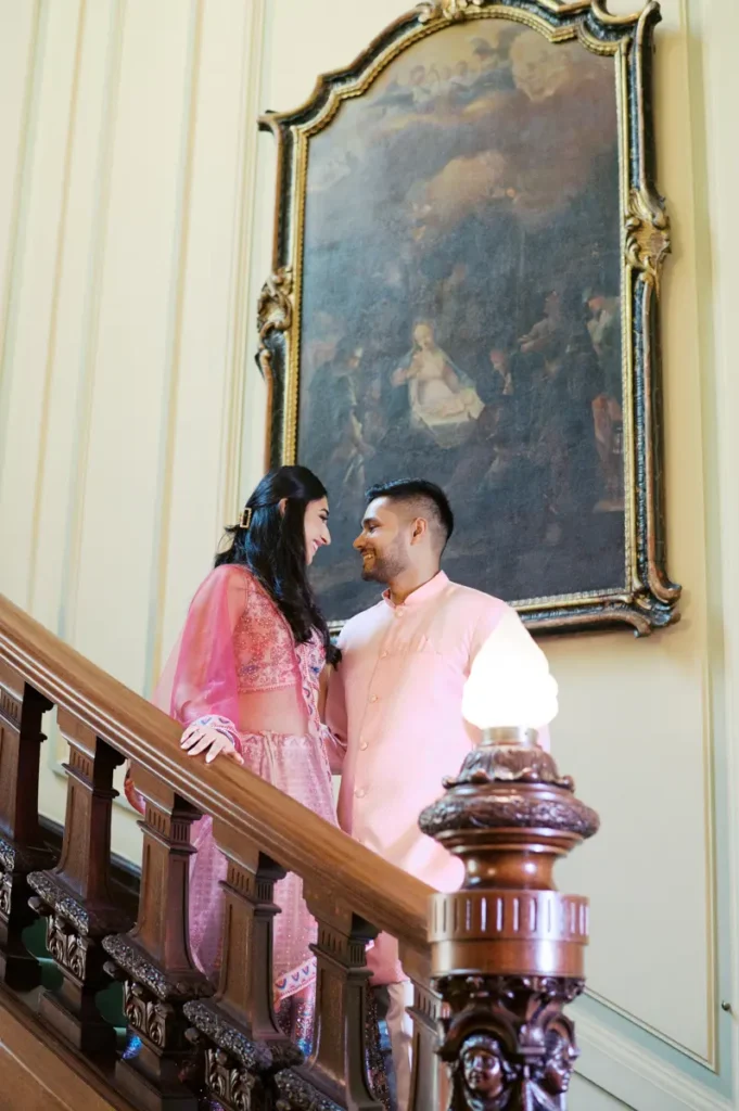 Começámos a nossa sessão nos interiores deslumbrantes do Pestana Palace Lisboa Hotel. A Karishma e o Shivam vestiram os seus lindíssimos trajes tradicionais indianos em tons vibrantes de cor-de-rosa. Esta escolha de paleta não podia ter sido mais perfeita: fundiu-se de forma magistral com a arquitetura clássica, os frescos e o luxo do hotel. Conseguimos uma estética puramente editorial, mas onde a boa disposição e a química do casal roubaram completamente a cena.