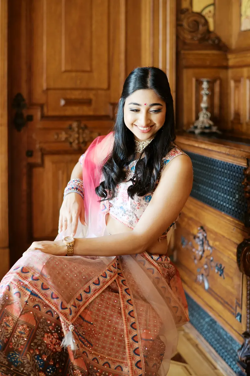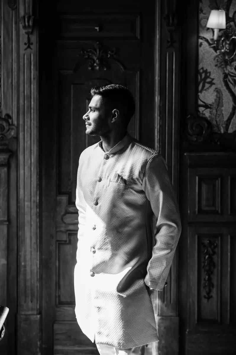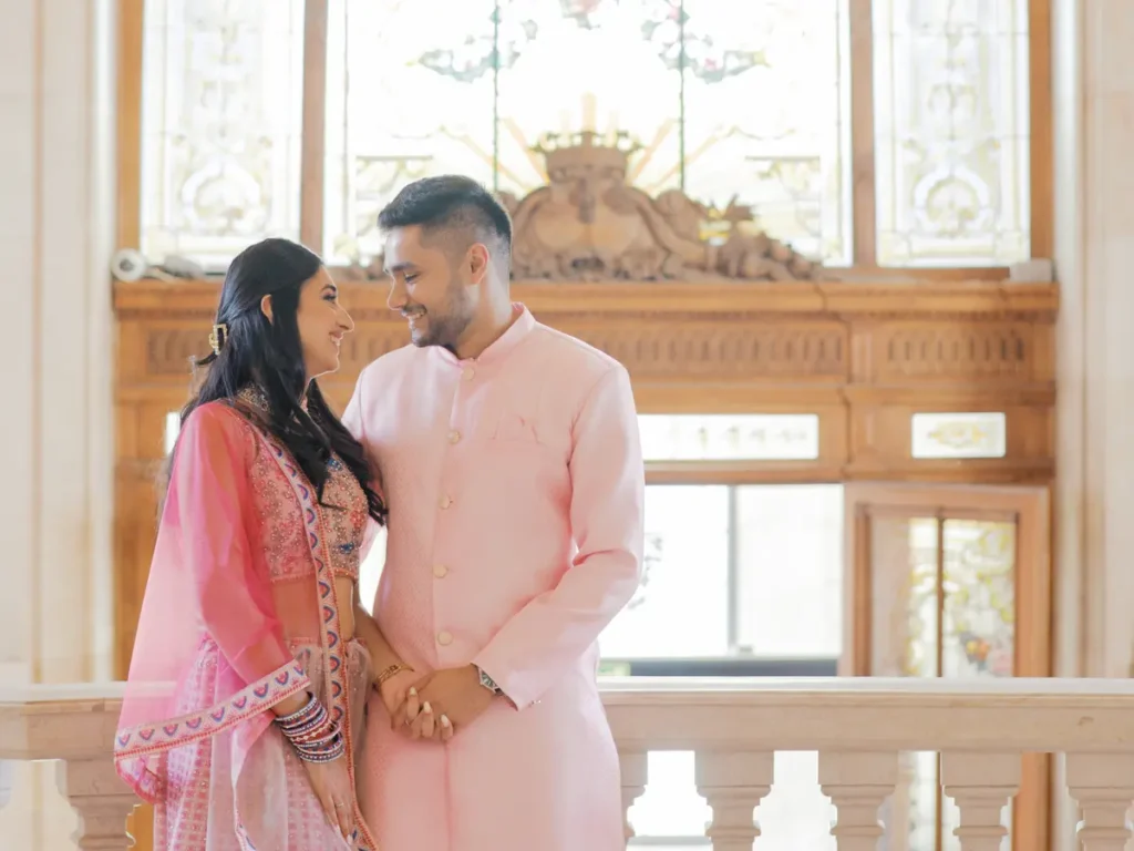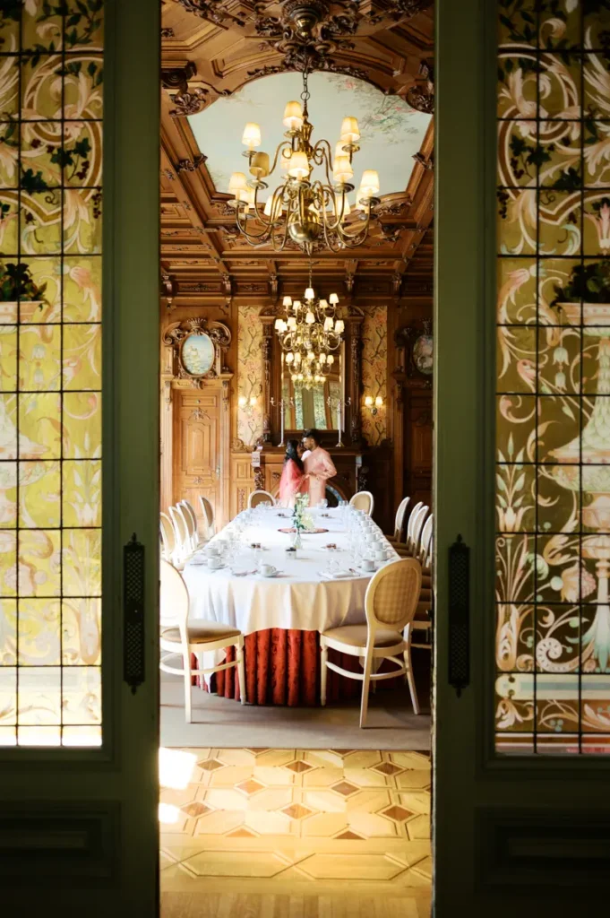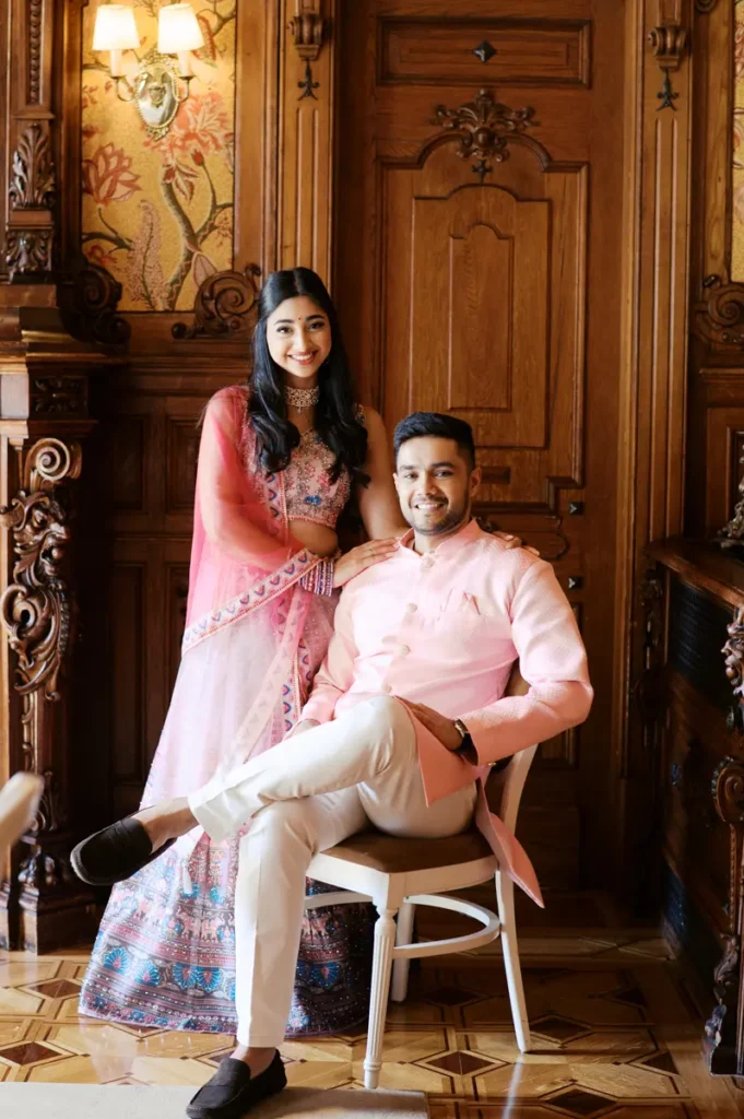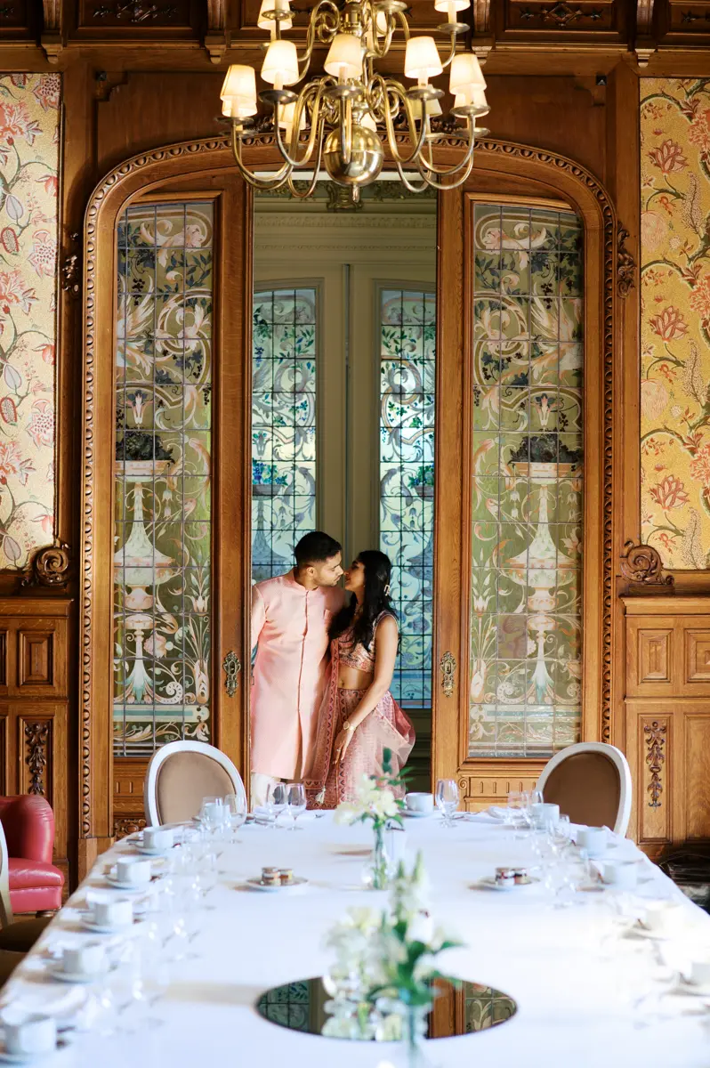 Começámos a nossa sessão nos interiores deslumbrantes do Pestana Palace Lisboa Hotel. A Karishma e o Shivam vestiram os seus lindíssimos trajes tradicionais indianos em tons vibrantes de cor-de-rosa. Esta escolha de paleta não podia ter sido mais perfeita: fundiu-se de forma magistral com a arquitetura clássica, os frescos e o luxo do hotel. Conseguimos uma estética puramente editorial, mas onde a boa disposição e a química do casal roubaram completamente a cena.