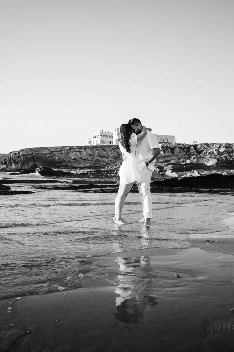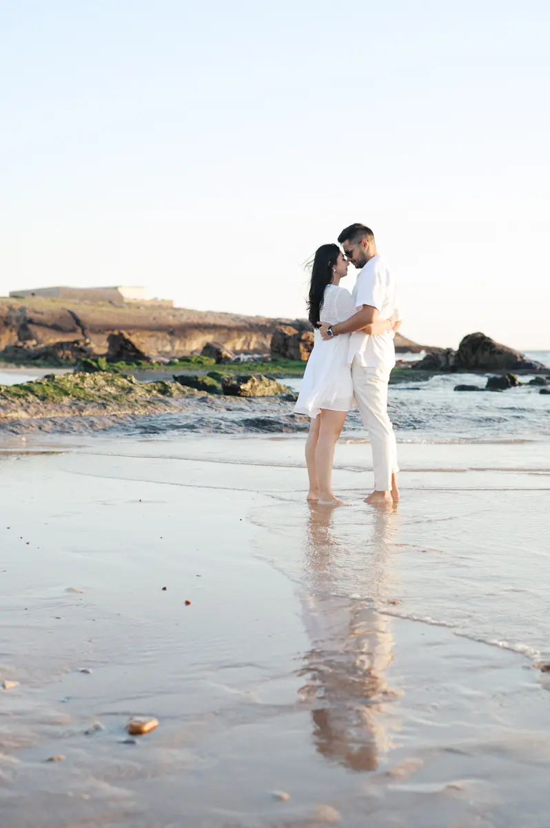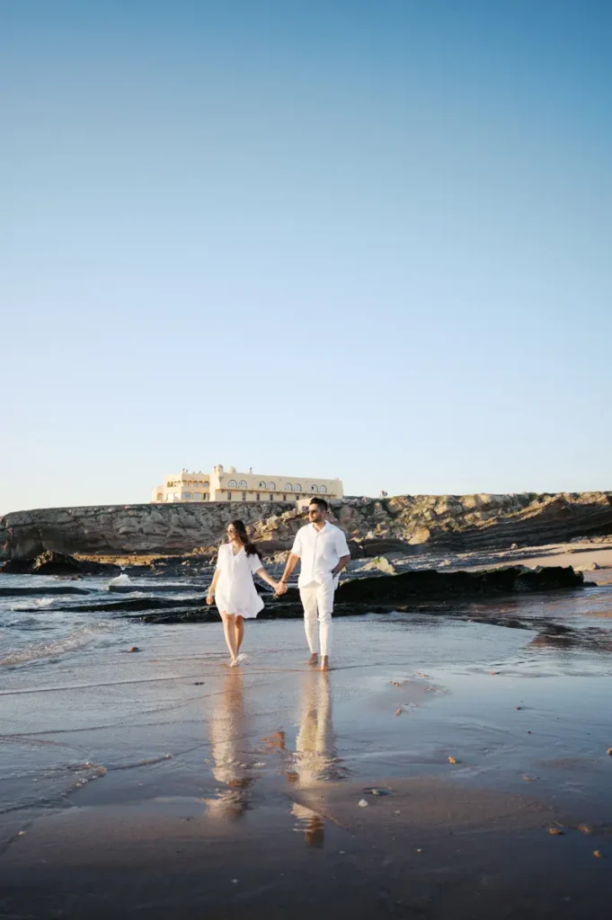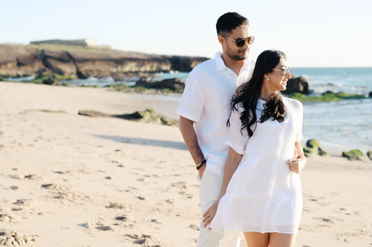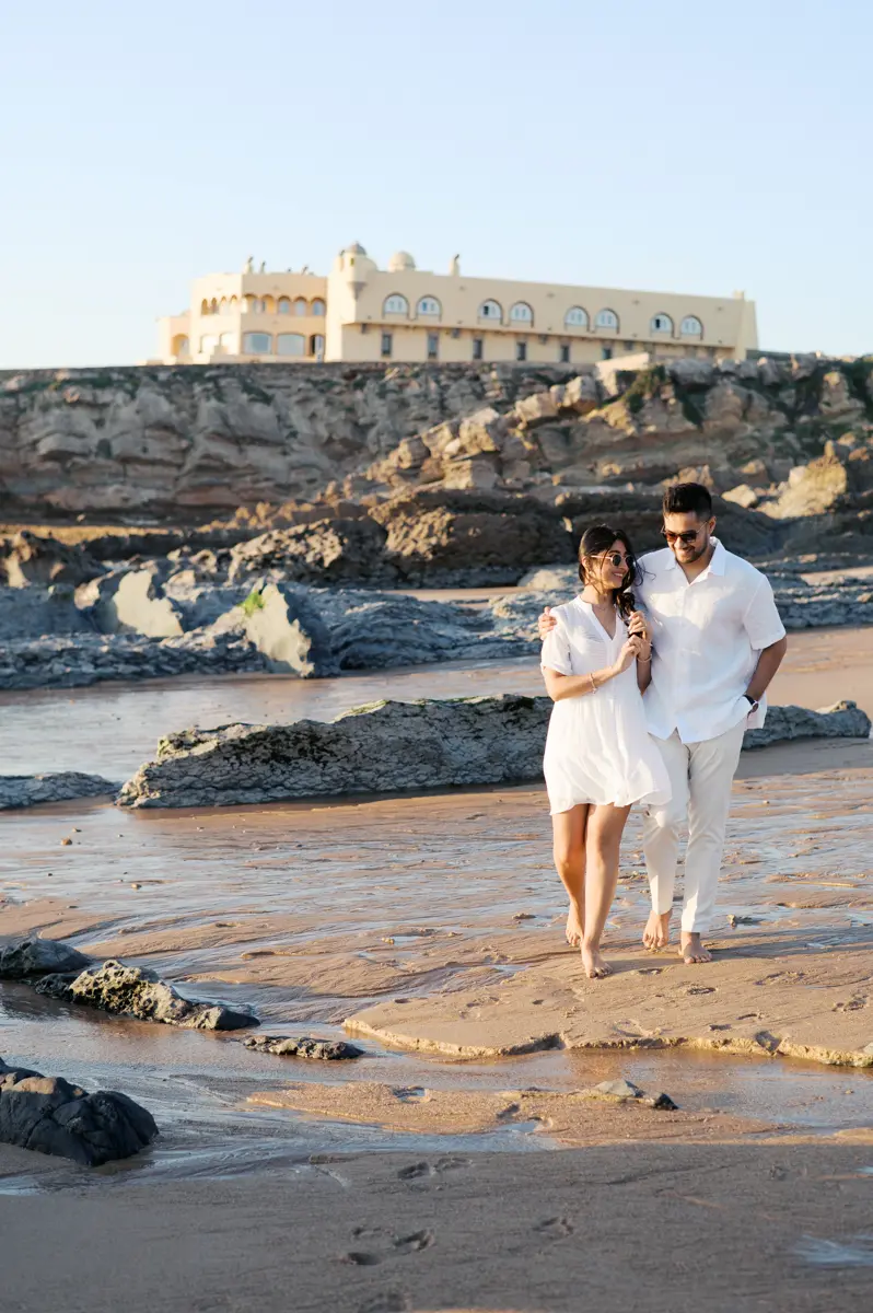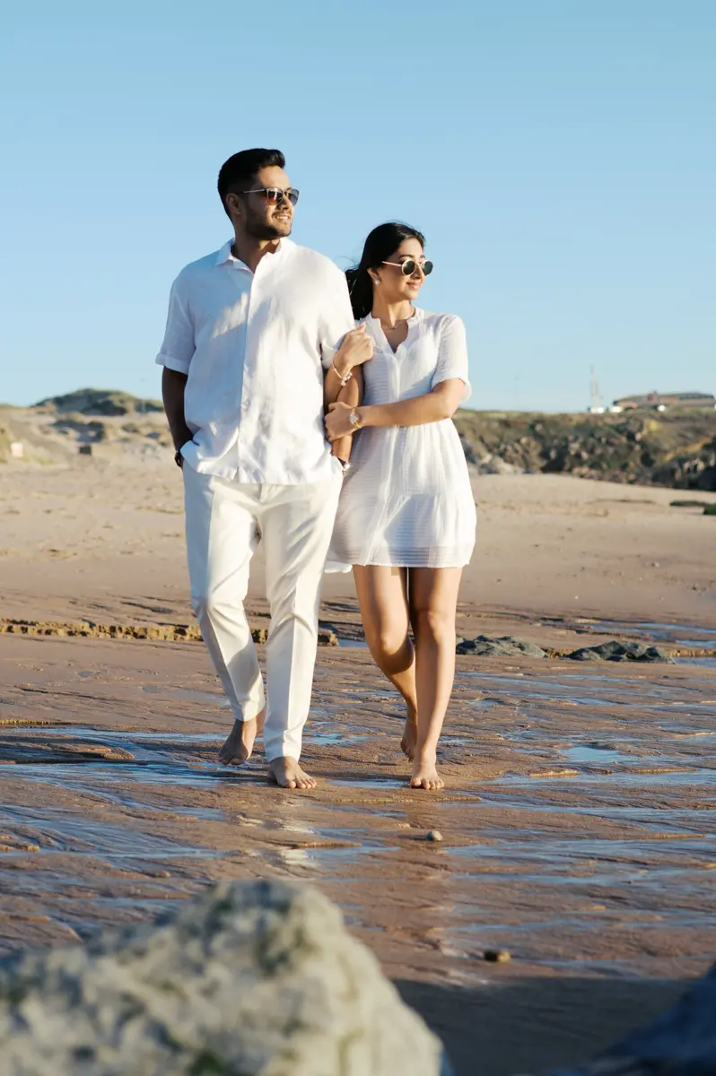 Para fechar a sessão com chave de ouro, deixámos a cidade e rumámos ao Guincho. Na incrível Praia da Cresmina, fomos presenteados com a luz mágica e quente do final do dia. Entre o vento característico da costa de Cascais e o som do mar, a Karishma e o Shivam entregaram-se totalmente ao momento. Aproveitámos a golden hour para criar imagens puras, incrivelmente românticas e cheias de movimento. O culminar perfeito para esta Love Session.