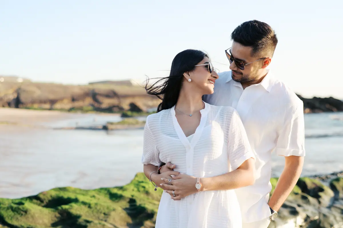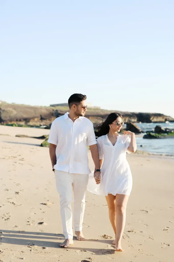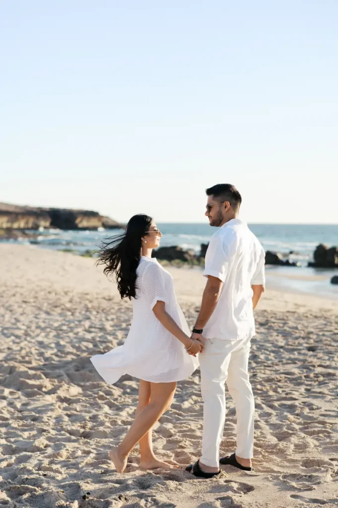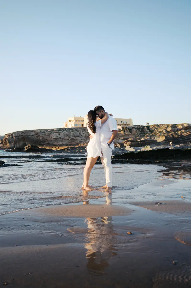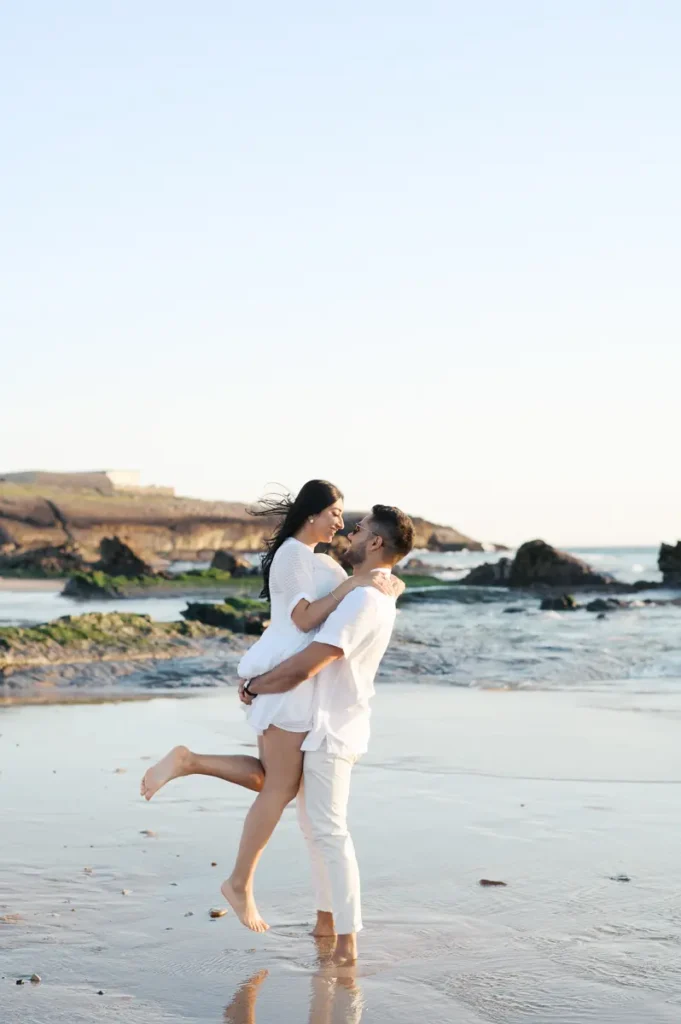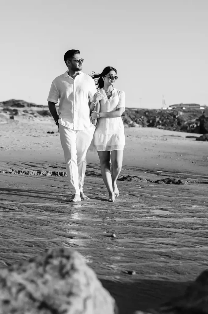 Para fechar a sessão com chave de ouro, deixámos a cidade e rumámos ao Guincho. Na incrível Praia da Cresmina, fomos presenteados com a luz mágica e quente do final do dia. Entre o vento característico da costa de Cascais e o som do mar, a Karishma e o Shivam entregaram-se totalmente ao momento. Aproveitámos a golden hour para criar imagens puras, incrivelmente românticas e cheias de movimento. O culminar perfeito para esta Love Session.