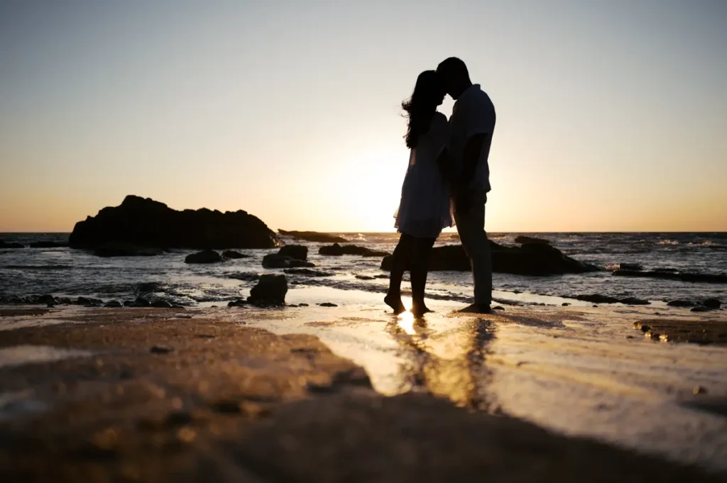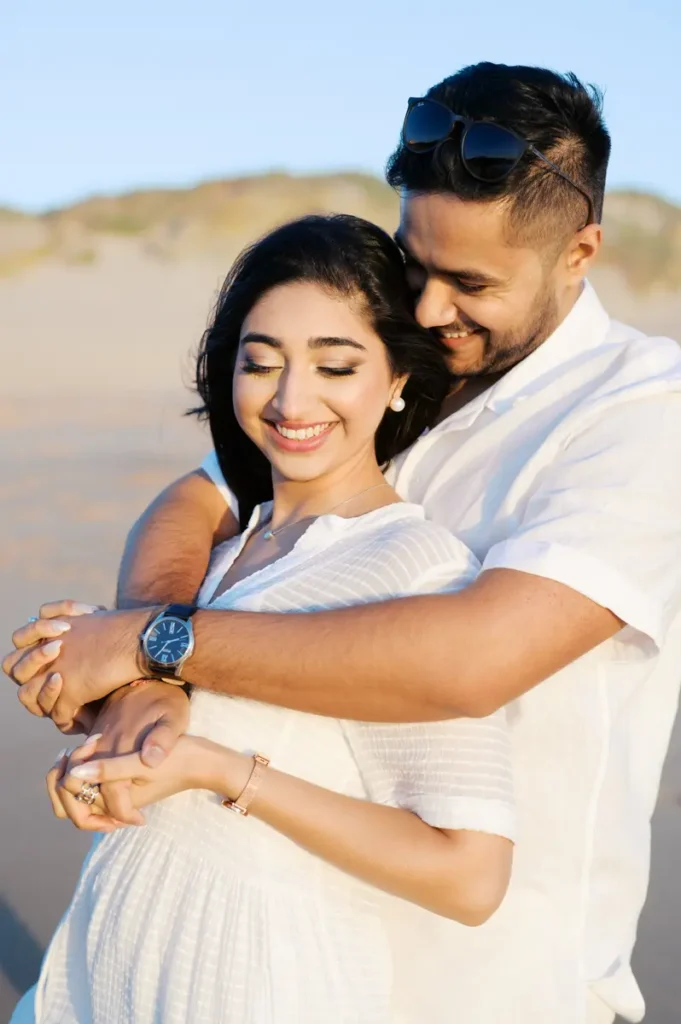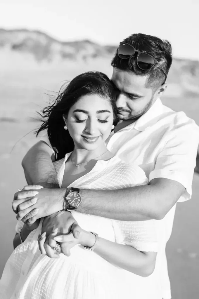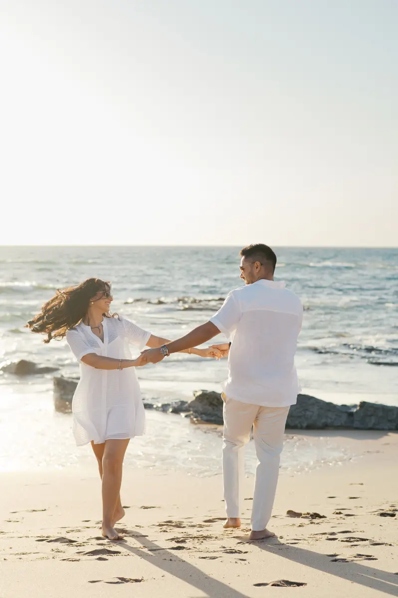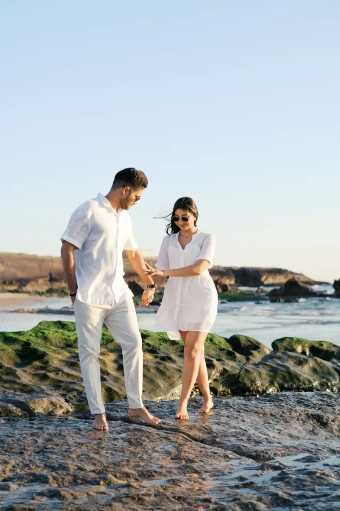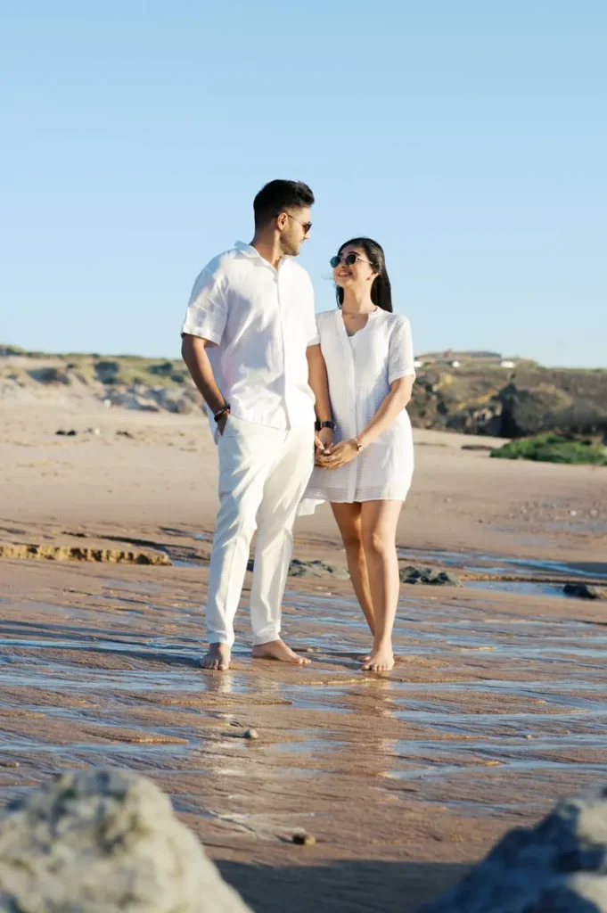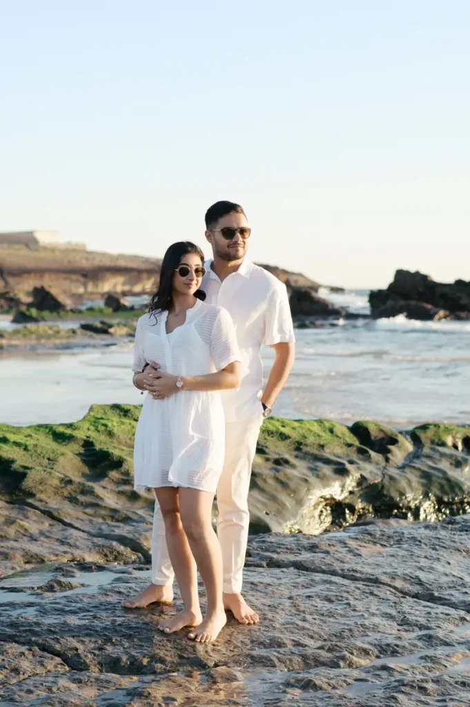 Para fechar a sessão com chave de ouro, deixámos a cidade e rumámos ao Guincho. Na incrível Praia da Cresmina, fomos presenteados com a luz mágica e quente do final do dia. Entre o vento característico da costa de Cascais e o som do mar, a Karishma e o Shivam entregaram-se totalmente ao momento. Aproveitámos a golden hour para criar imagens puras, incrivelmente românticas e cheias de movimento. O culminar perfeito para esta Love Session.