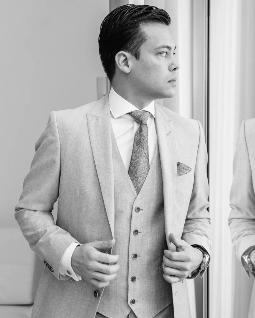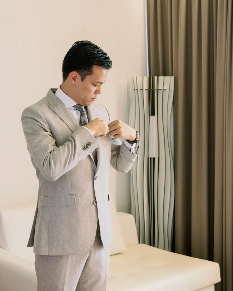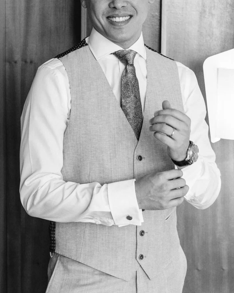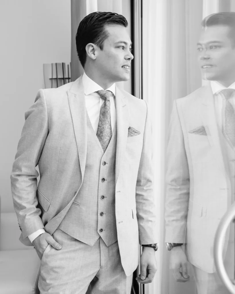Em contraste absoluto, a preparação do Alex decorreu noutra suite do Onyria, imersa numa tranquilidade quase palpável. Com a nossa abordagem documental, preservámos a calma, a expectativa e a serenidade do noivo antes de caminhar para o altar, sem nunca interferir no desenrolar orgânico da manhã.