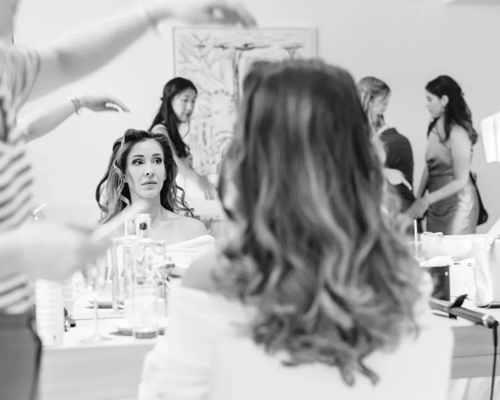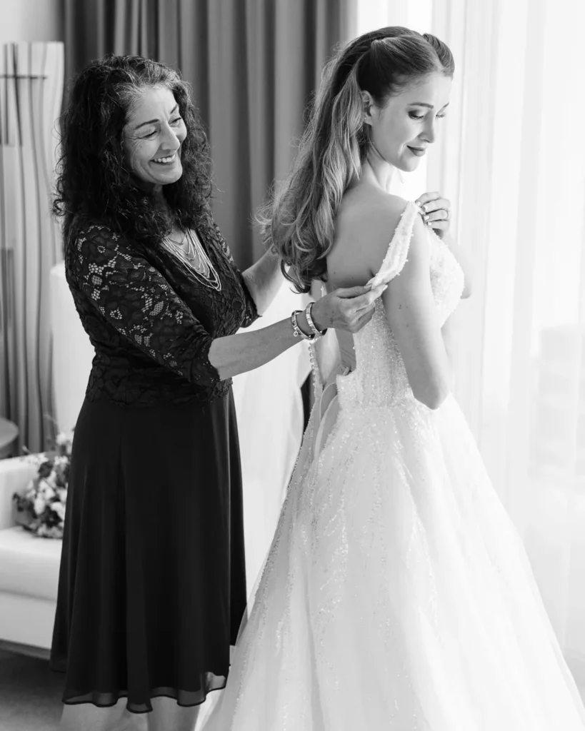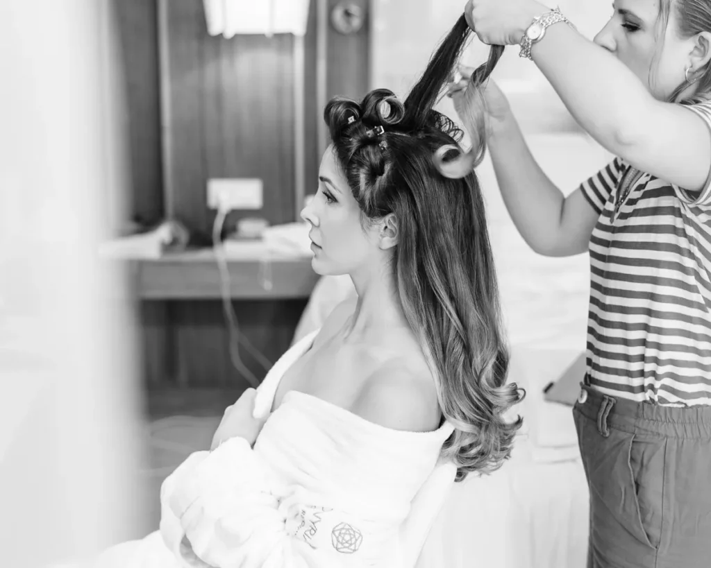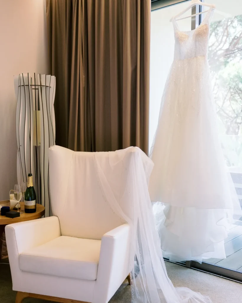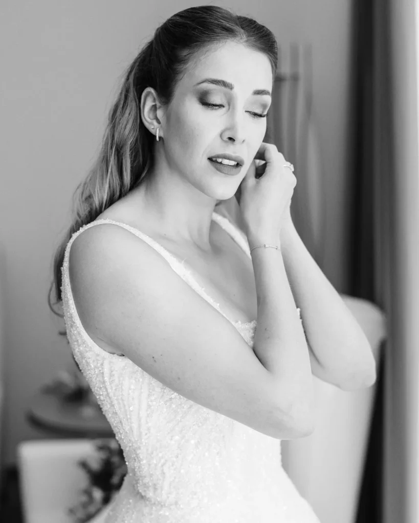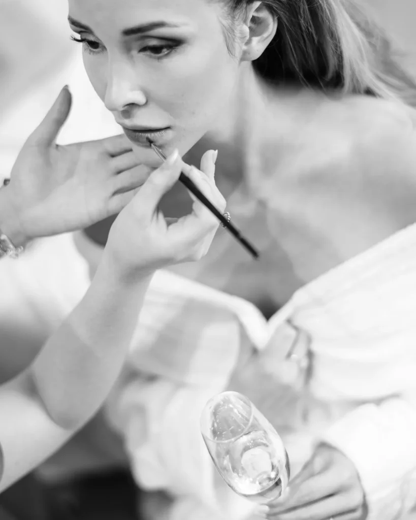 A preparação da Lenna aconteceu numa das suites do hotel e foi a prova de que a vida real é sempre a mais fascinante. Com um ligeiro atraso a instalar um caos vibrante, e a maquilhagem e cabelos entregues carinhosamente às mãos de uma amiga convidada, documentámos a energia, a ansiedade e a beleza pura de instantes que não se repetem. A nossa presença, como sempre, manteve-se invisível, registando a verdade do momento.