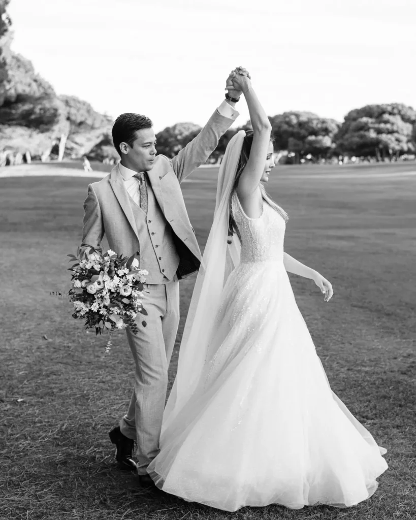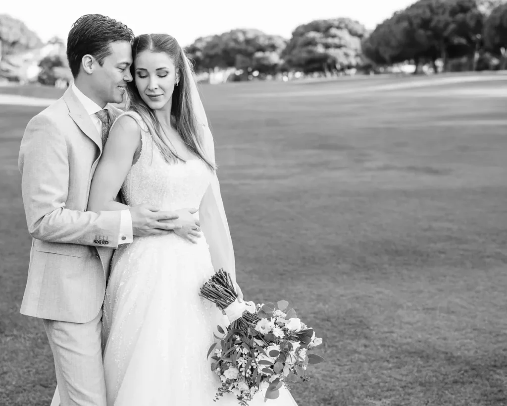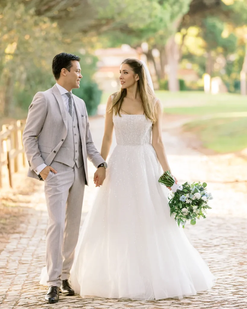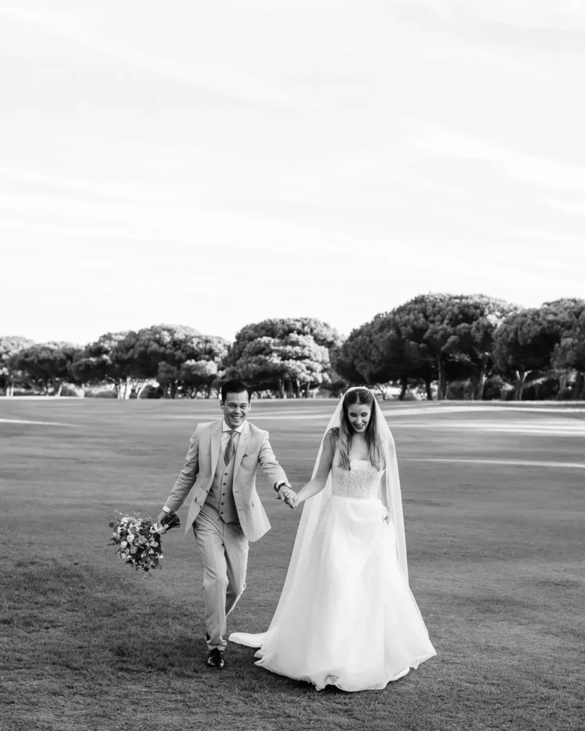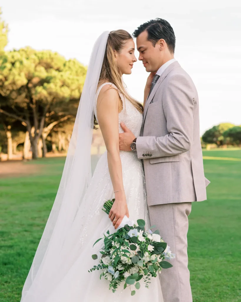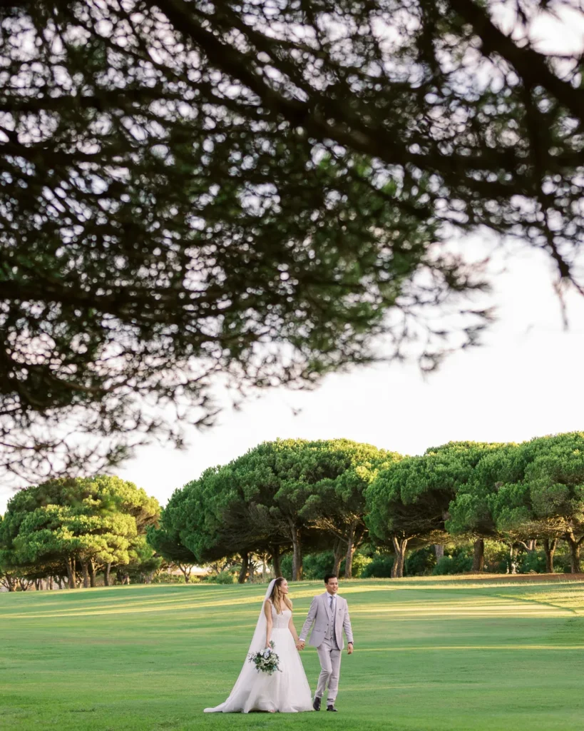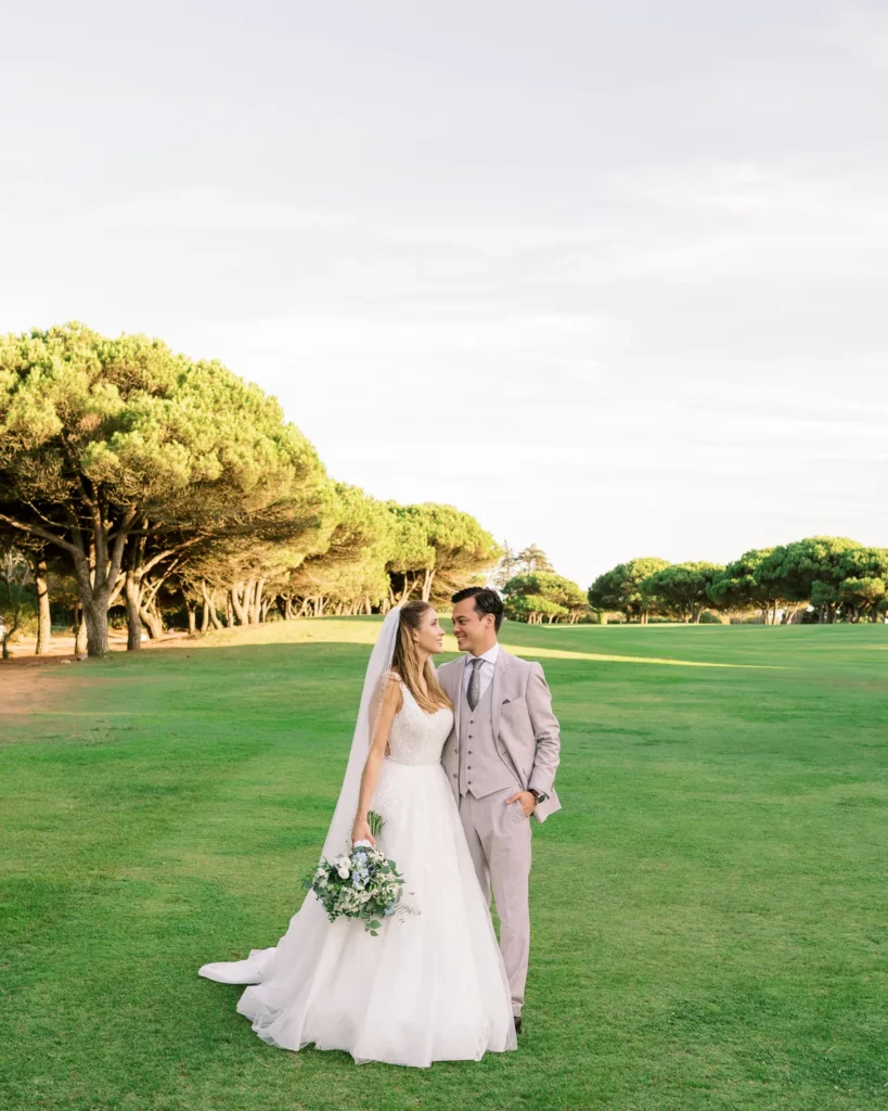 Já conhecíamos a química maravilhosa deste casal desde a sua sessão pré-casamento no imponente Palácio Nacional de Queluz (que partilharemos em breve noutra galeria). Por isso, a sessão a dois no dia do casamento foi incrivelmente breve, solta e fluida. Aproveitámos o espaço aberto do campo de golfe do hotel para os envolver na luz mágica do fim de tarde, captando a sua essência sem os afastar dos seus convidados.