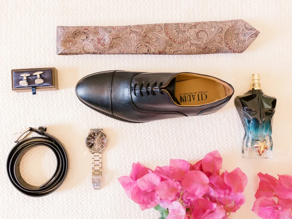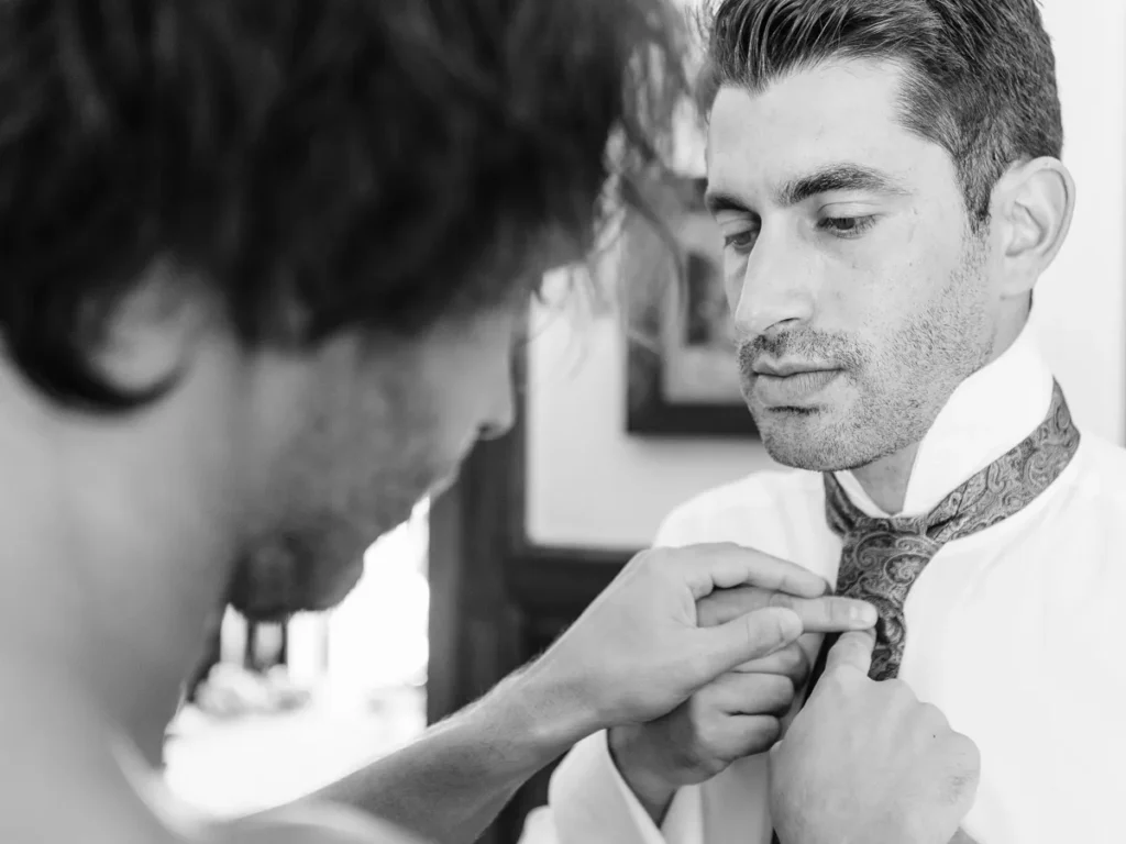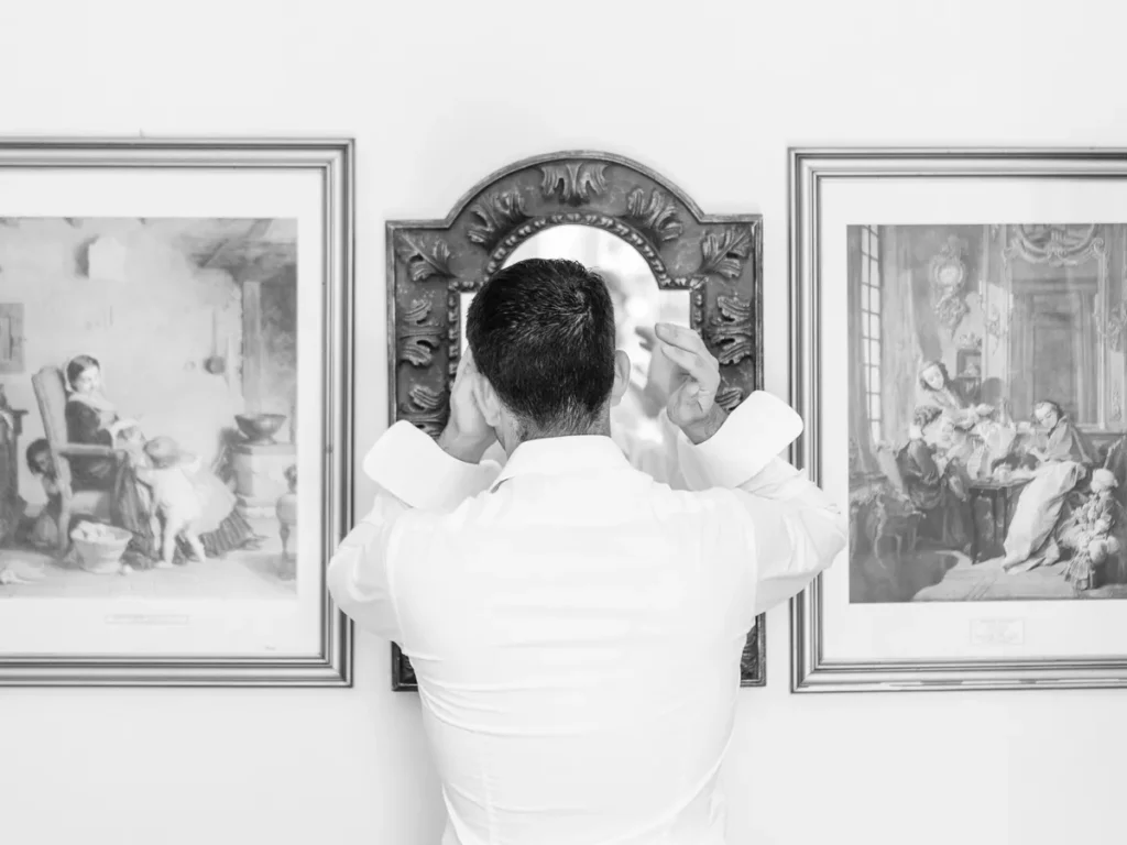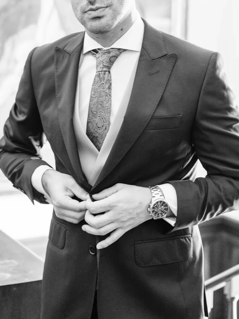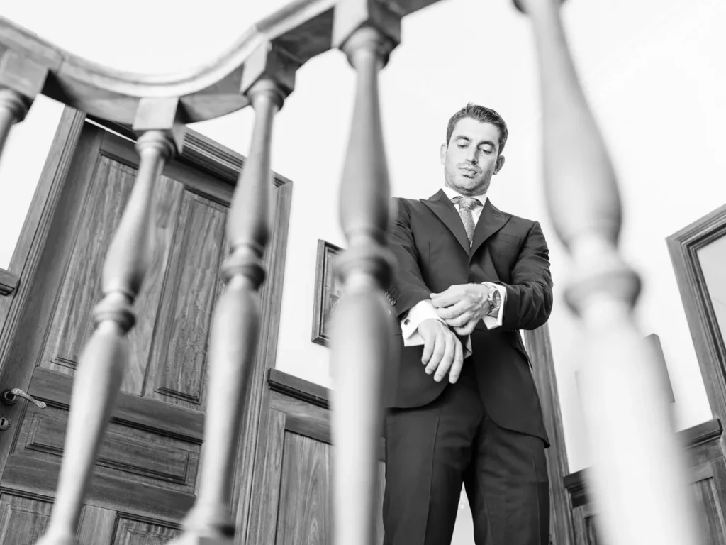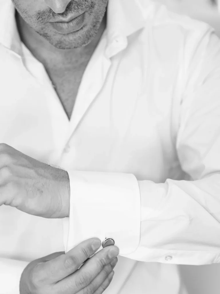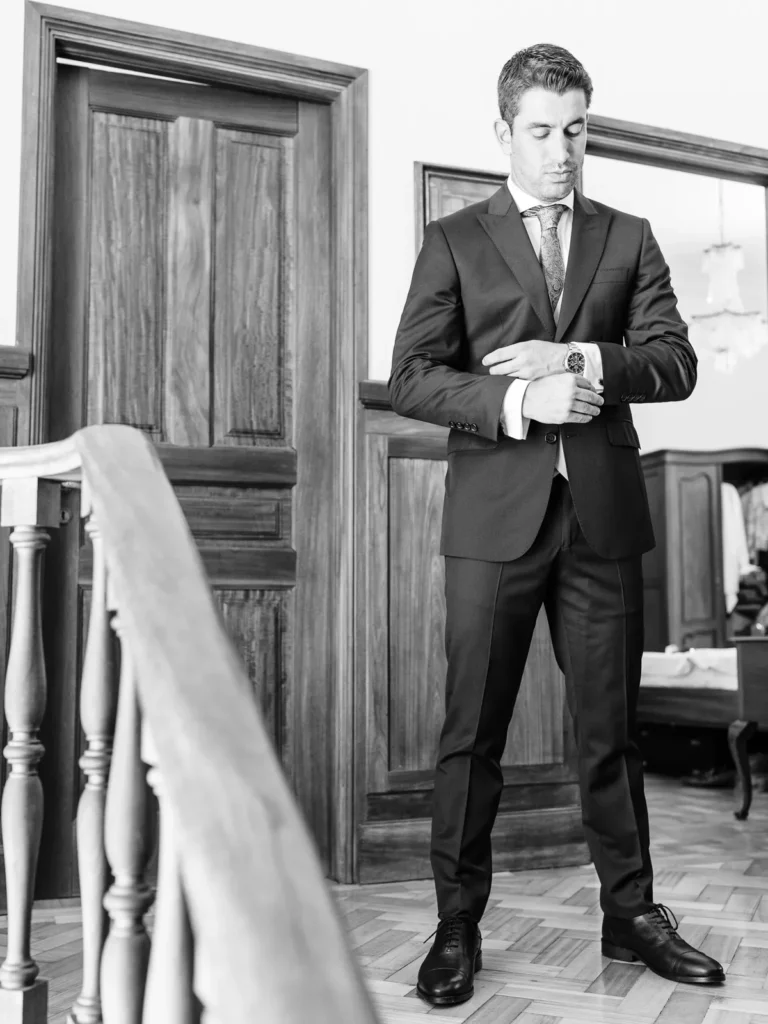 O Nuno preparou-se na casa de um familiar, muito perto da igreja onde viria a decorrer a cerimónia. A energia do espaço era excelente, num verdadeiro “caos controlado” repleto de abraços e reencontros. Sempre de sorriso no rosto, o Nuno dividia o tempo entre os últimos ajustes do seu fato e os calorosos cumprimentos aos familiares que iam chegando. Fomos sombras atentas, documentando cada gargalhada de forma invisível.