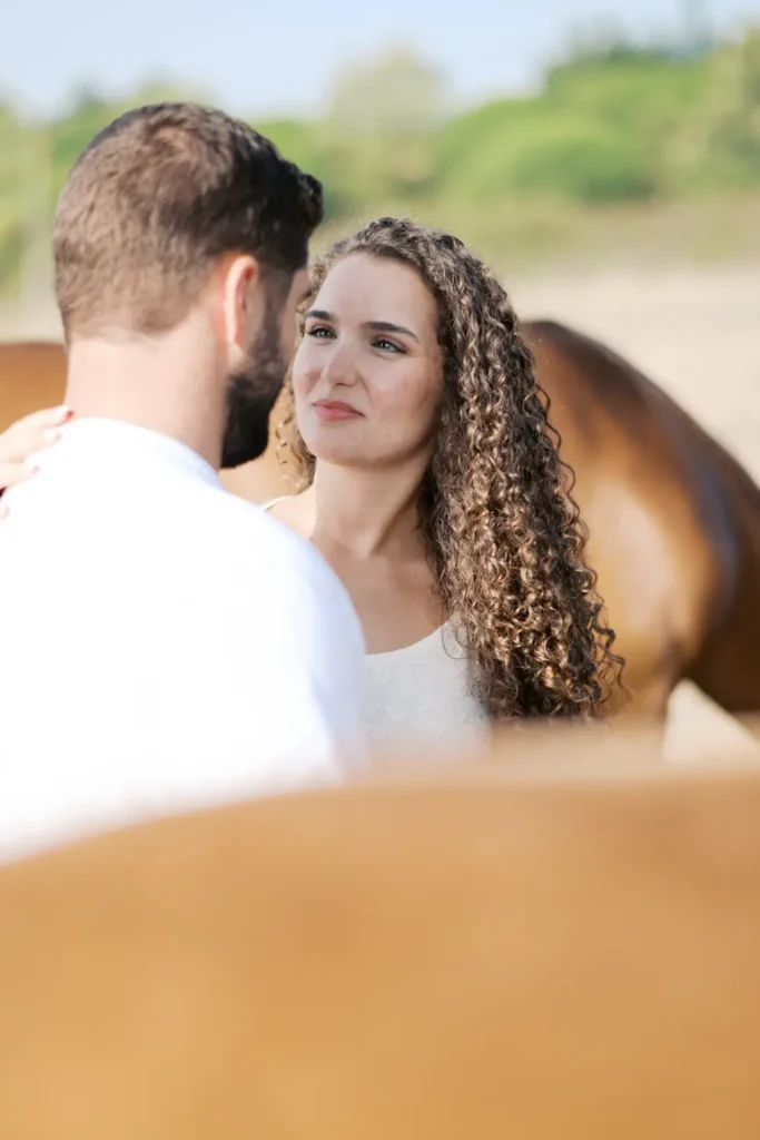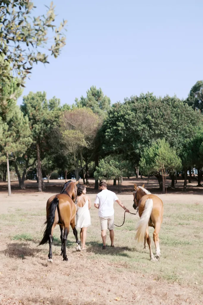 Passear a pé ao lado de dois animais tão imponentes poderia ser um desafio fotográfico, mas o Napoleão e a Safira mostraram-se incrivelmente meigos e colaborantes. A nossa abordagem documental permitiu-nos registar a ligação genuína e o carinho do casal pelos seus cavalos, sem forçar o momento. A elegância natural da raça Lusitana conferiu aos retratos uma estética fine art majestosa, digna de um editorial.