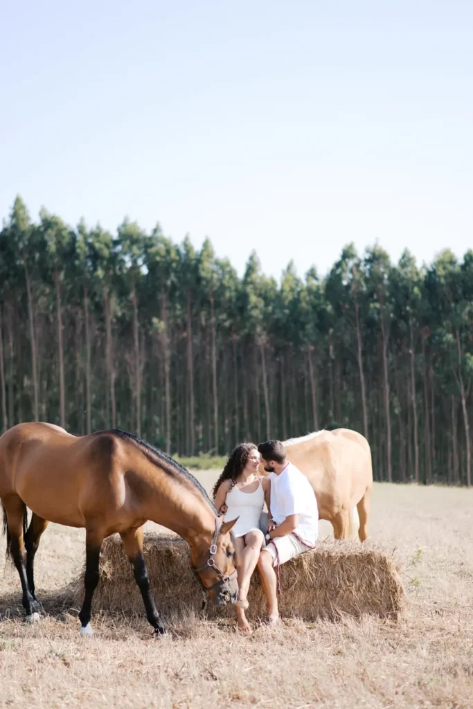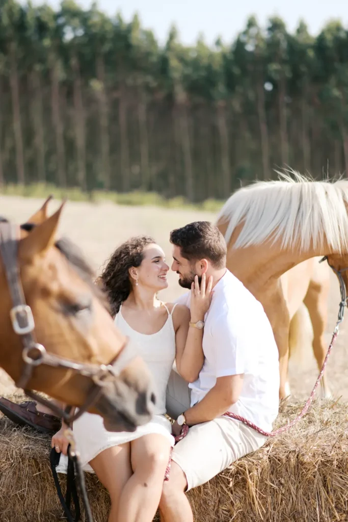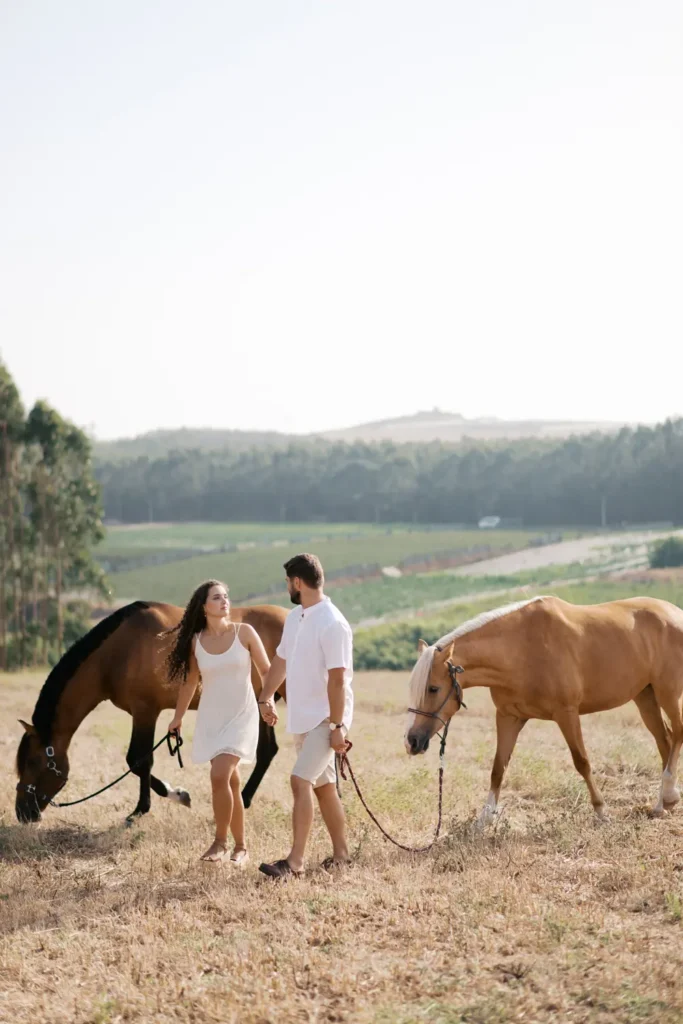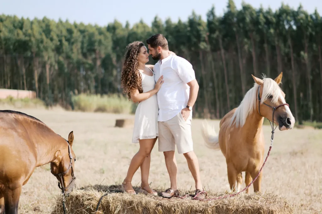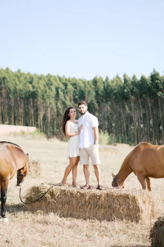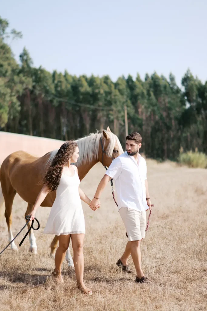 A Sónia e o Cristiano planearam uma sessão de noivado (ou pre-wedding) verdadeiramente especial e dividida em duas partes que refletem a sua essência. Começámos a nossa tarde num terreno sereno, bem perto da casa dos pais da noiva. O motivo? Os noivos queriam partilhar as primeiras fotografias deste legado com o Napoleão e a Safira, os seus dois magníficos cavalos de raça Lusitana.