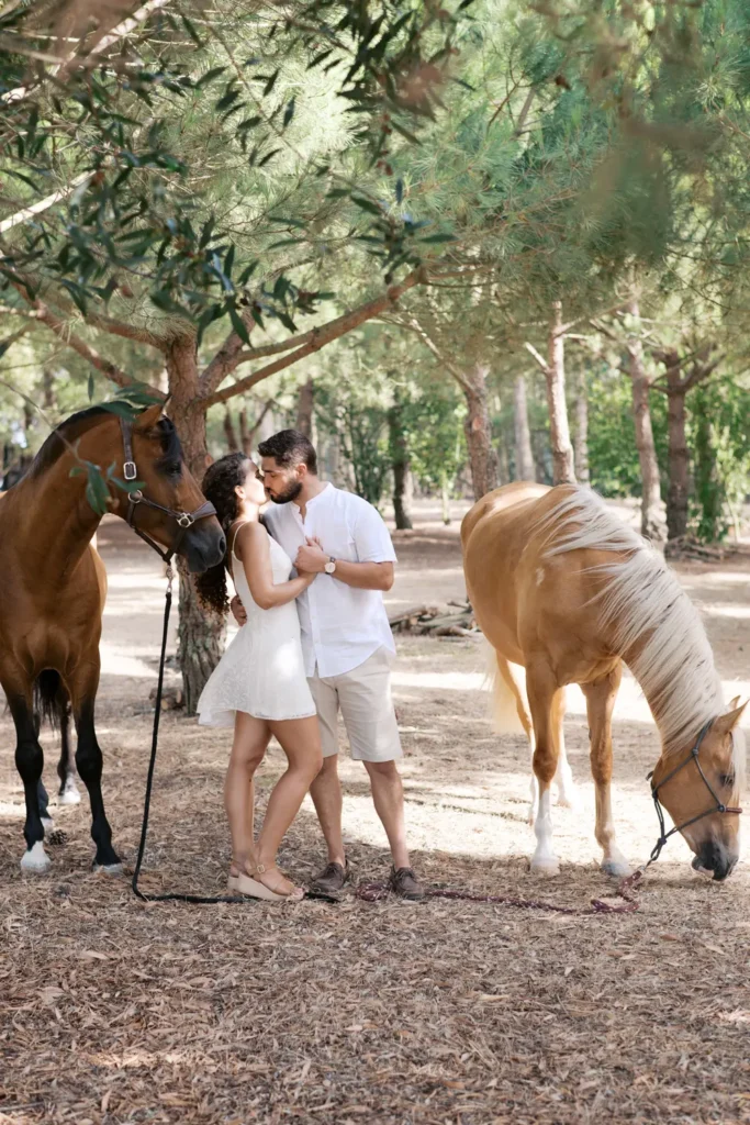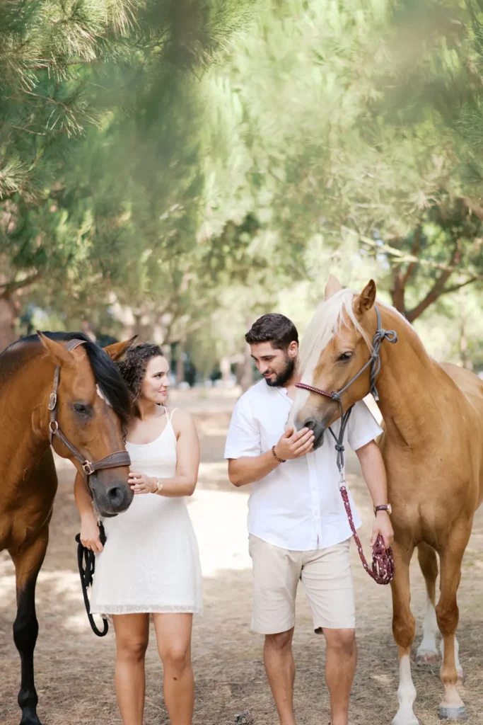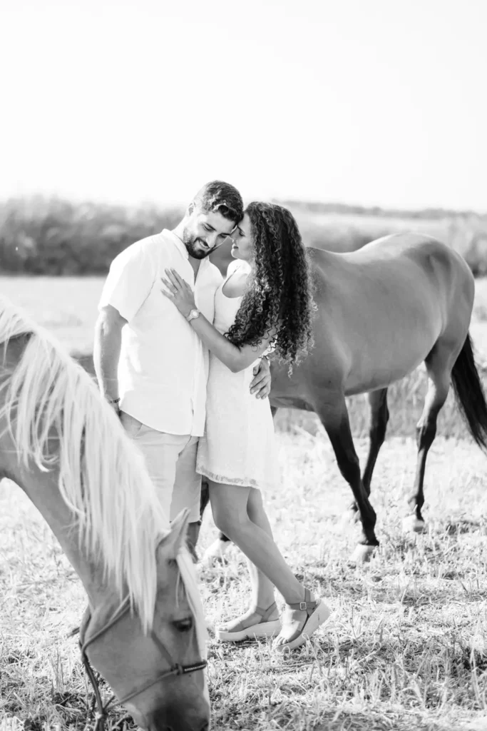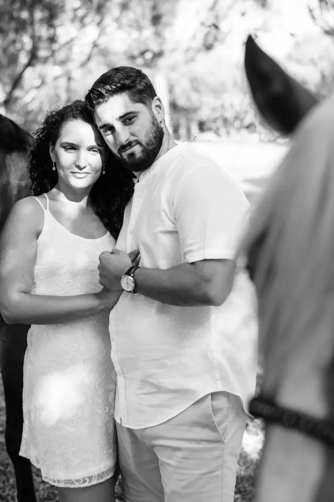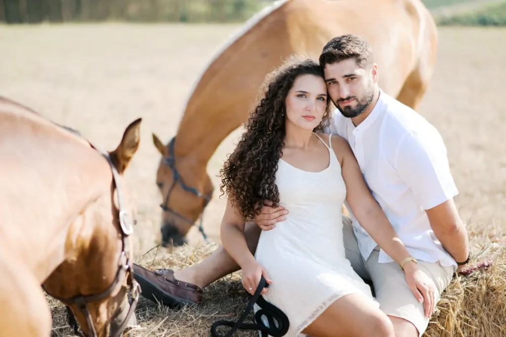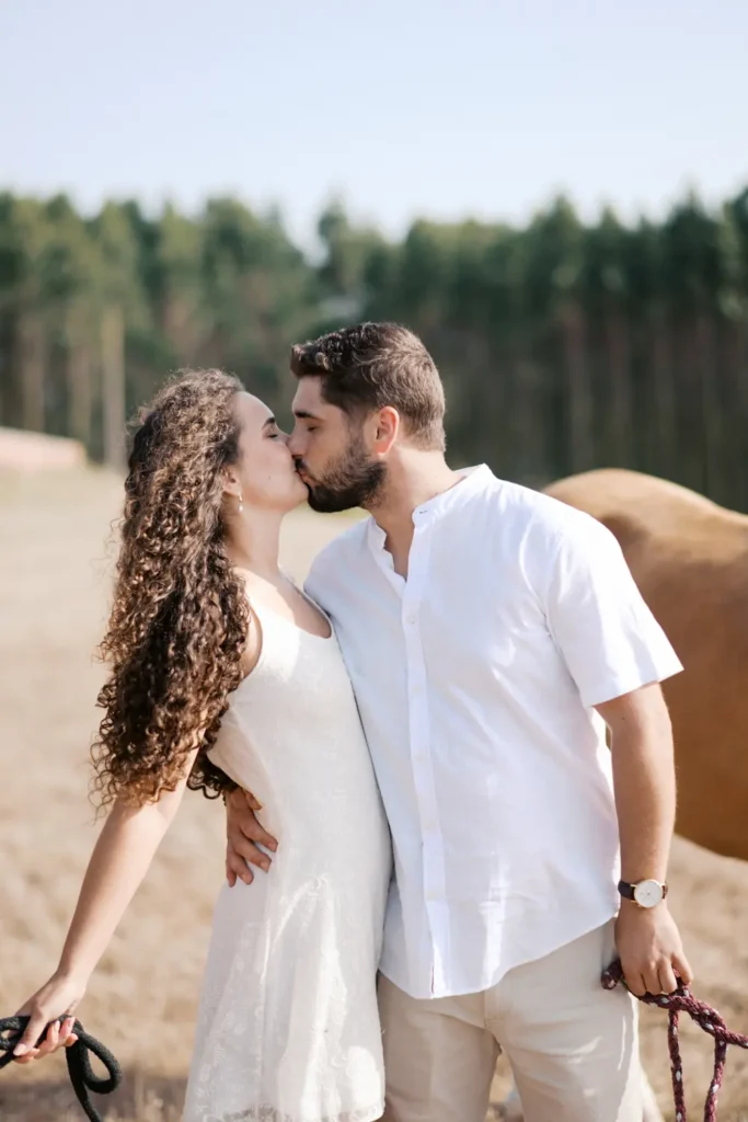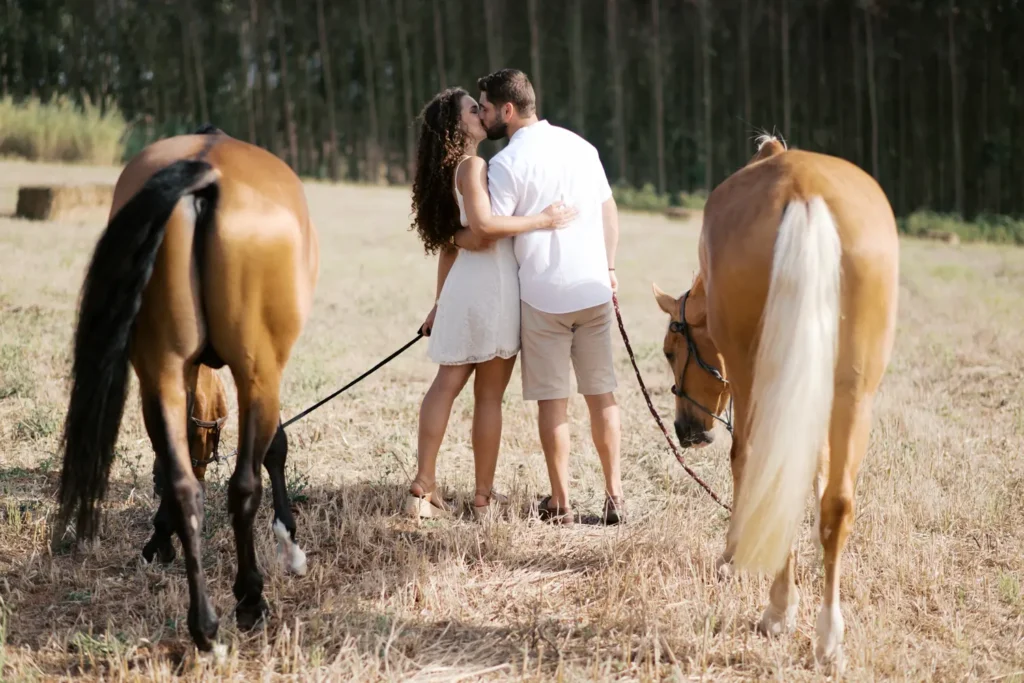 A Sónia e o Cristiano planearam uma sessão de noivado (ou pre-wedding) verdadeiramente especial e dividida em duas partes que refletem a sua essência. Começámos a nossa tarde num terreno sereno, bem perto da casa dos pais da noiva. O motivo? Os noivos queriam partilhar as primeiras fotografias deste legado com o Napoleão e a Safira, os seus dois magníficos cavalos de raça Lusitana.
