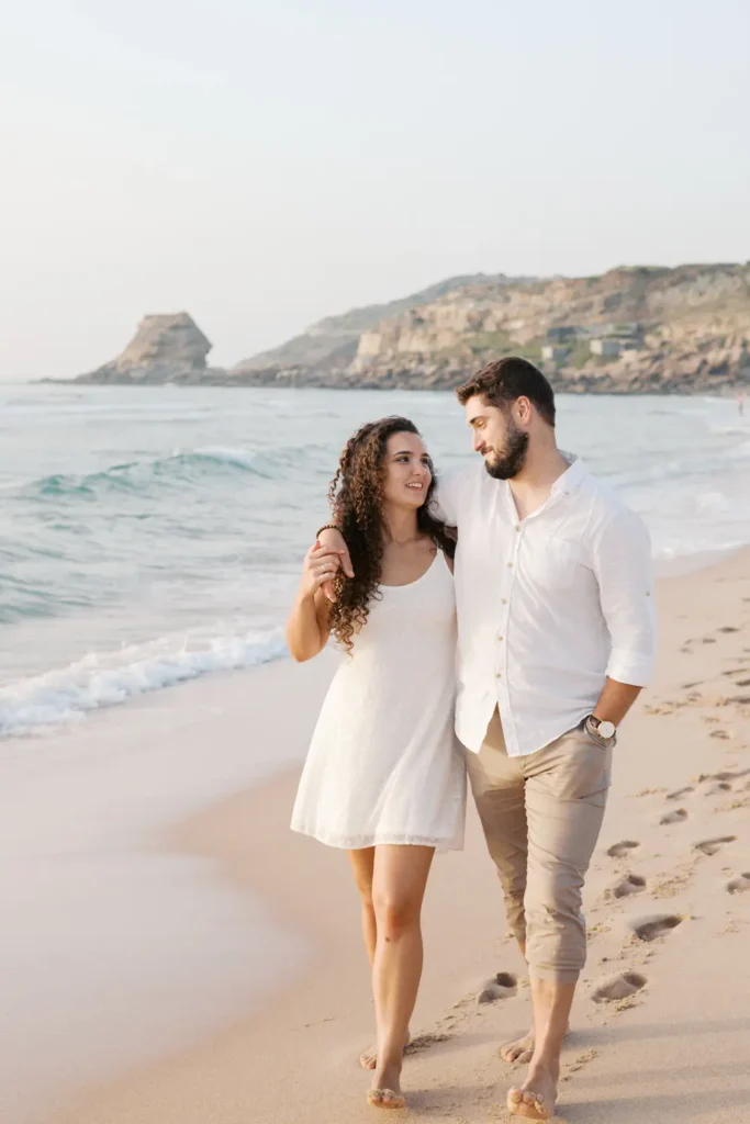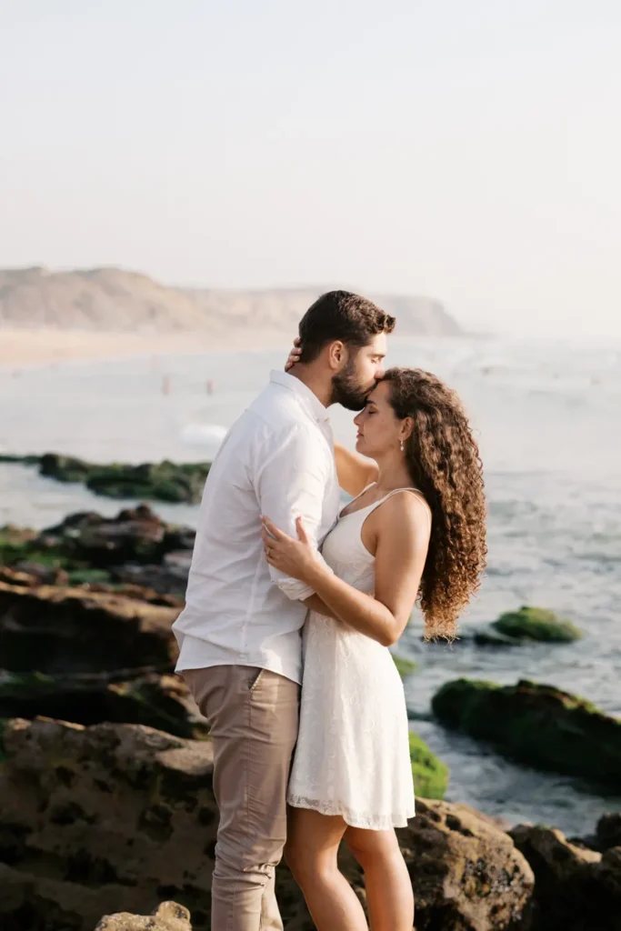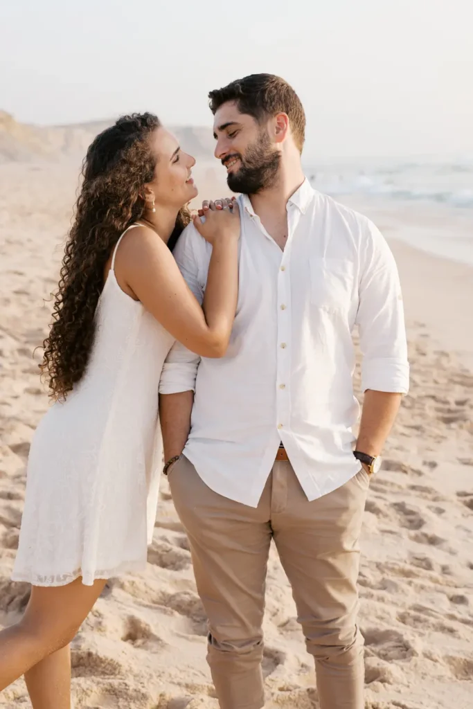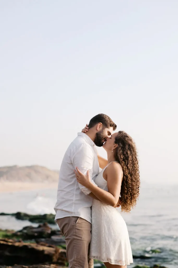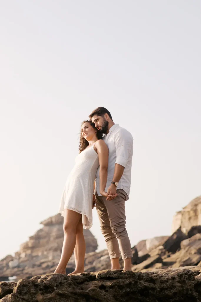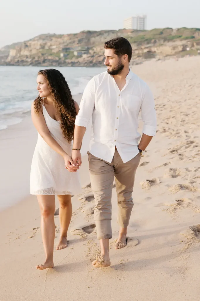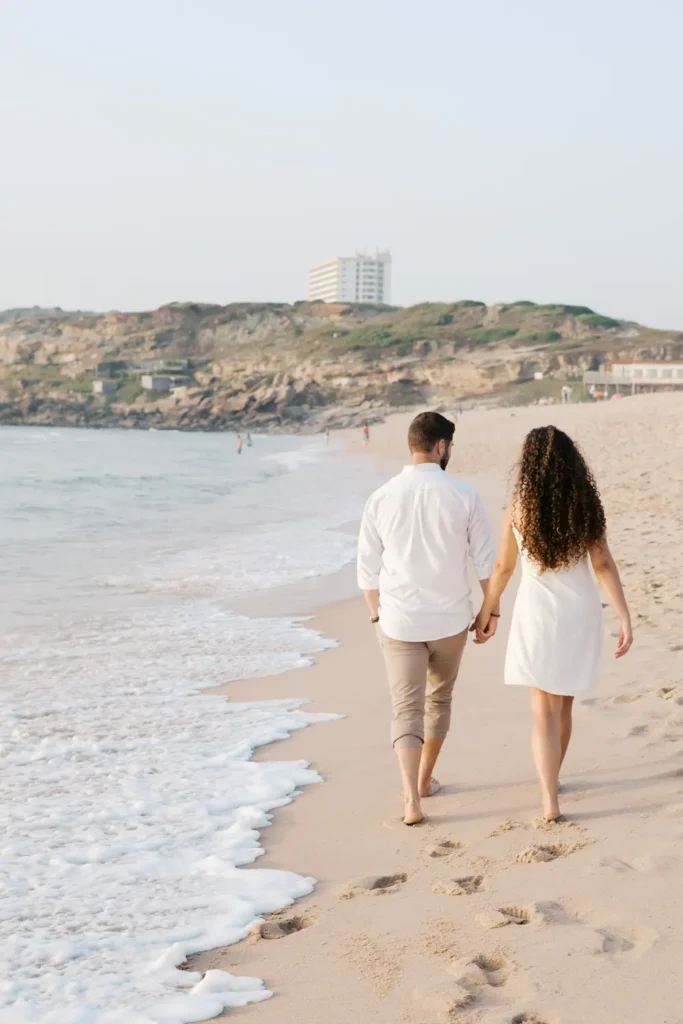 Depois de nos despedirmos dos cavalos, mudámos de cenário e rumámos em direção ao mar. O destino escolhido foi a belíssima Praia do Porto Novo, no Vimeiro (Torres Vedras). Chegámos no momento exato em que a golden hour começava a pintar o céu com tons quentes. Deixámos o casal namorar e caminhar pelo areal, aproveitando a luz incrível e a brisa marítima para captar imagens puras, românticas e cheias de movimento.
