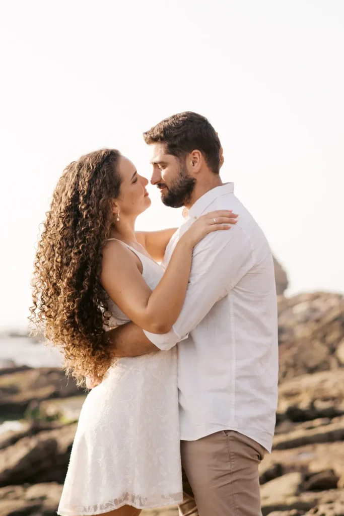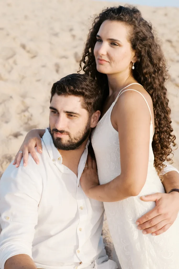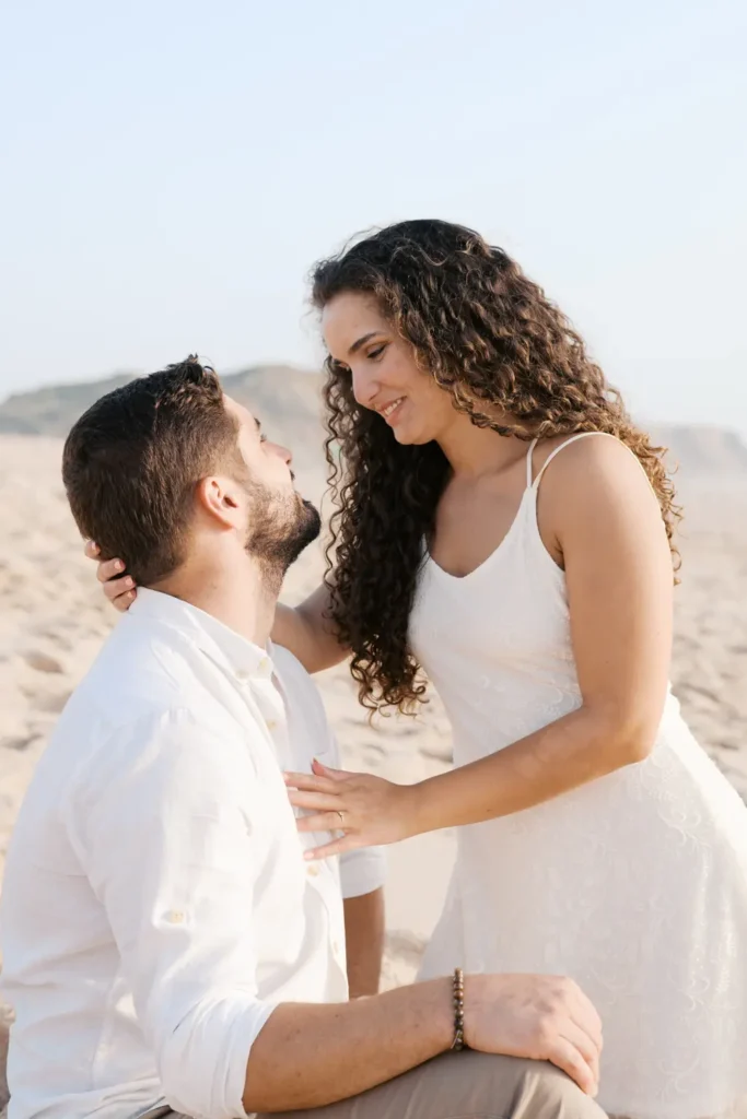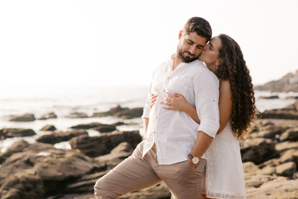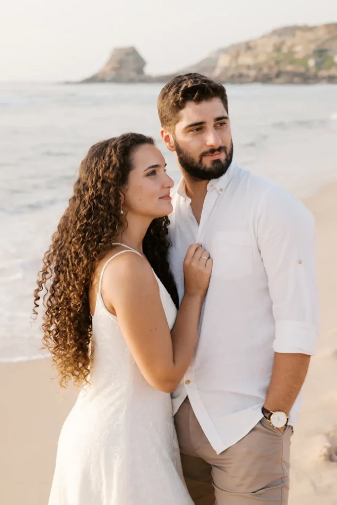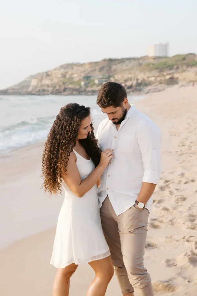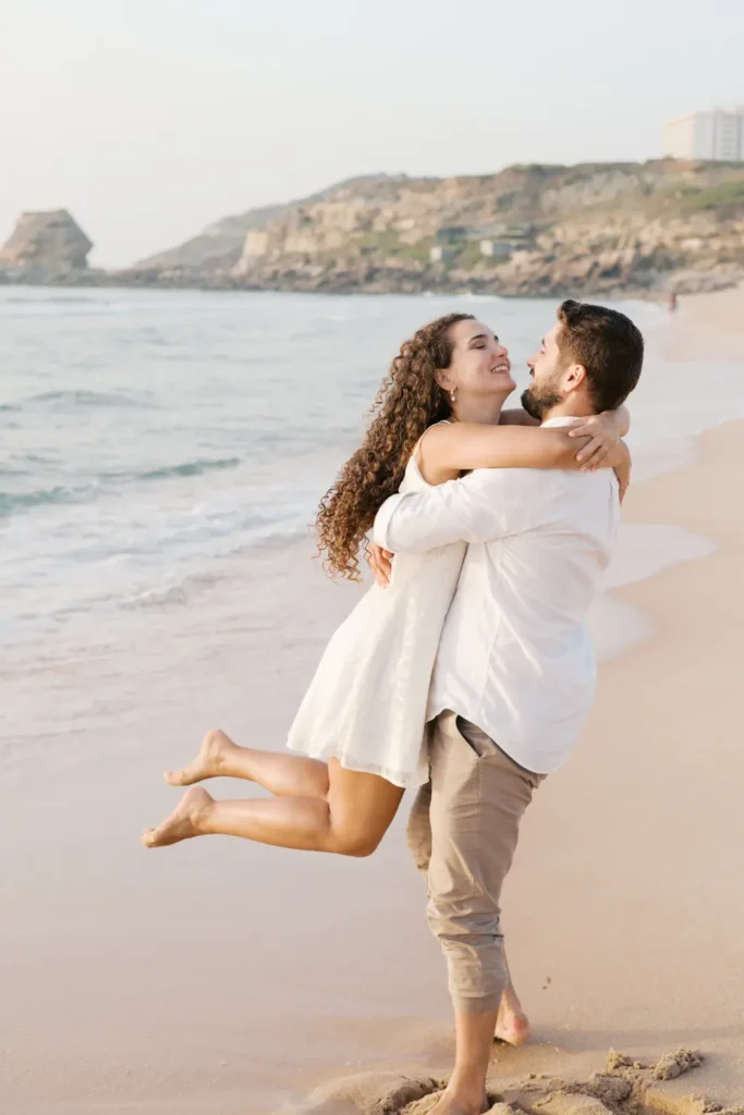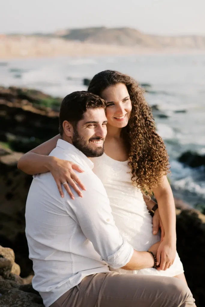 Depois de nos despedirmos dos cavalos, mudámos de cenário e rumámos em direção ao mar. O destino escolhido foi a belíssima Praia do Porto Novo, no Vimeiro (Torres Vedras). Chegámos no momento exato em que a golden hour começava a pintar o céu com tons quentes. Deixámos o casal namorar e caminhar pelo areal, aproveitando a luz incrível e a brisa marítima para captar imagens puras, românticas e cheias de movimento.