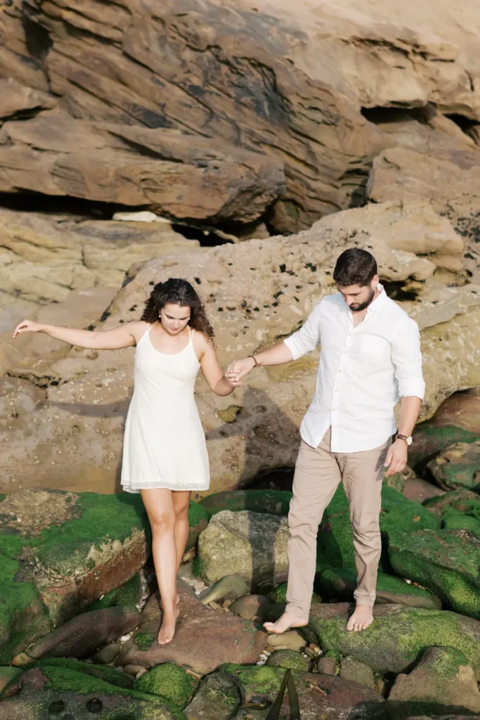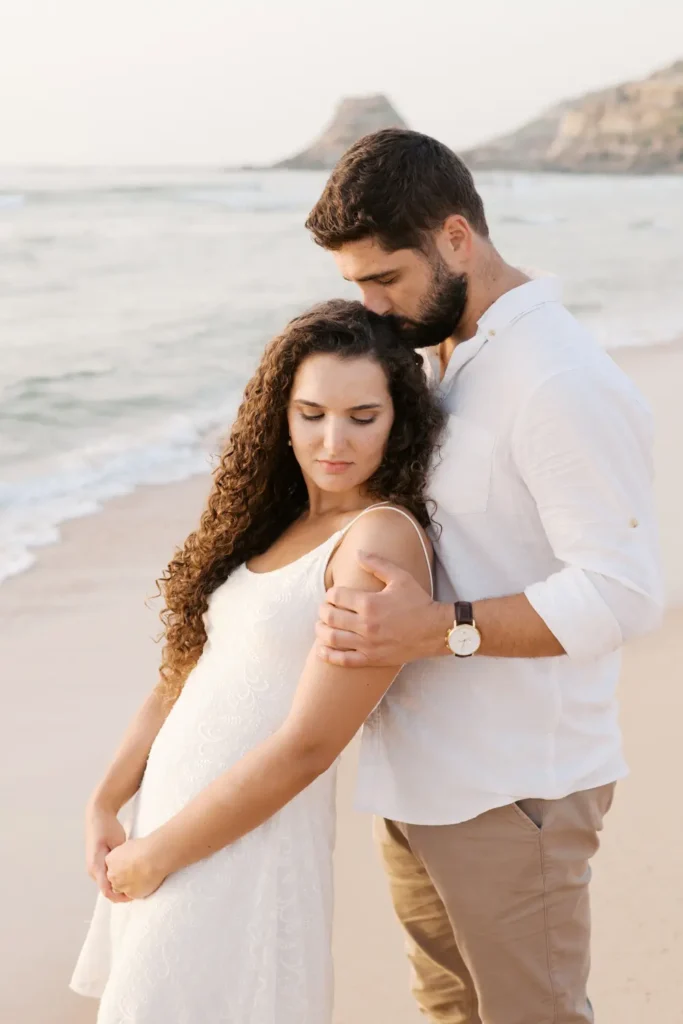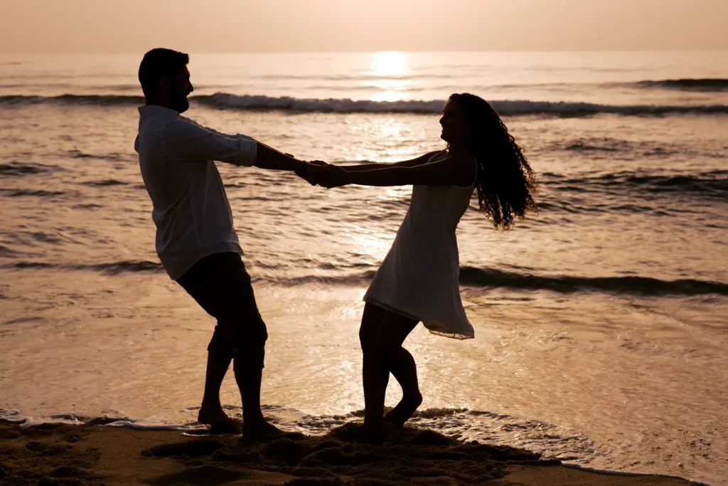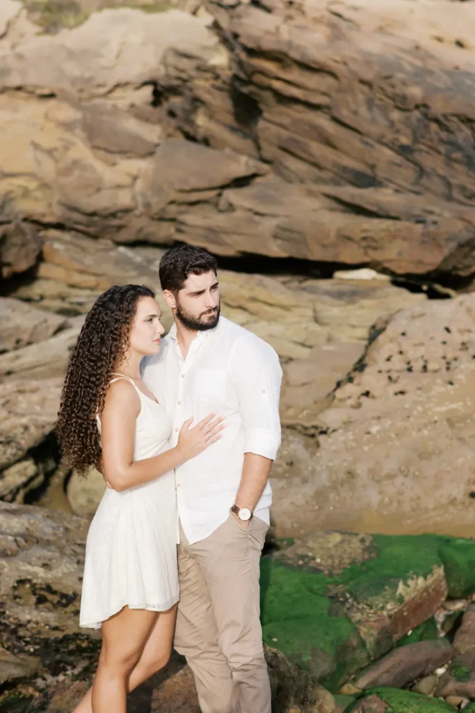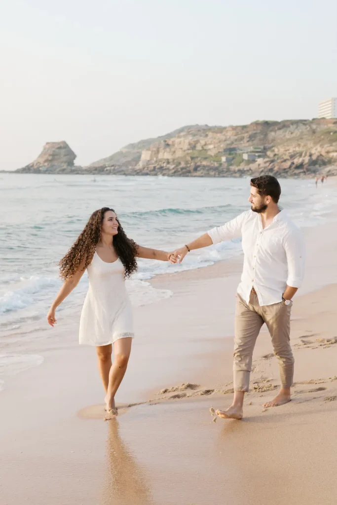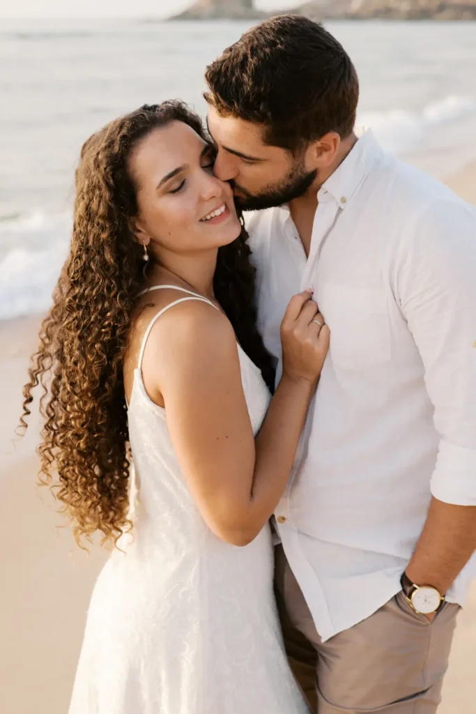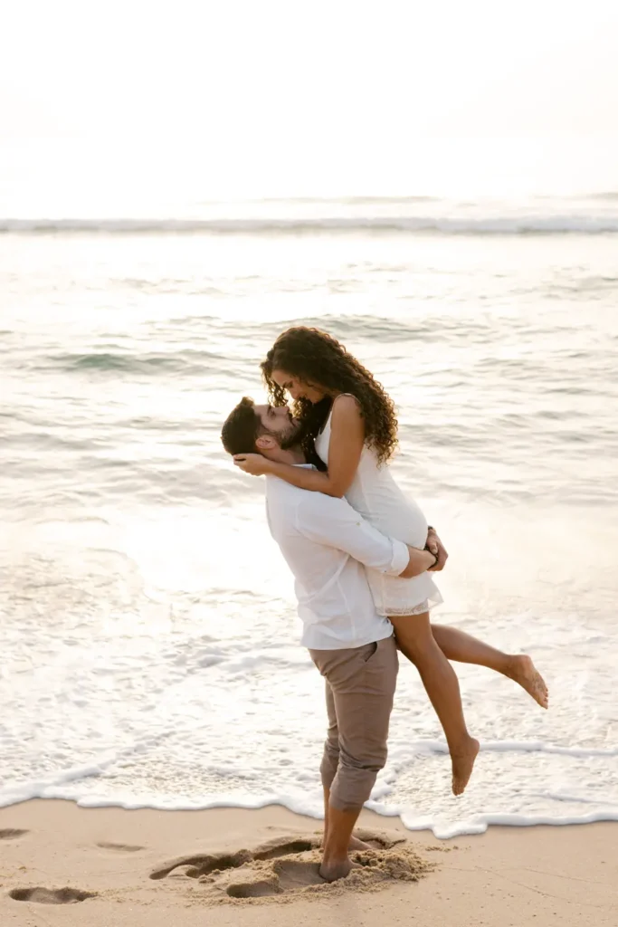 Depois de nos despedirmos dos cavalos, mudámos de cenário e rumámos em direção ao mar. O destino escolhido foi a belíssima Praia do Porto Novo, no Vimeiro (Torres Vedras). Chegámos no momento exato em que a golden hour começava a pintar o céu com tons quentes. Deixámos o casal namorar e caminhar pelo areal, aproveitando a luz incrível e a brisa marítima para captar imagens puras, românticas e cheias de movimento.