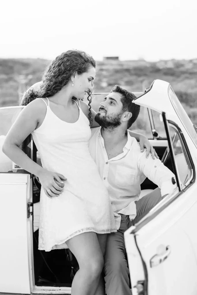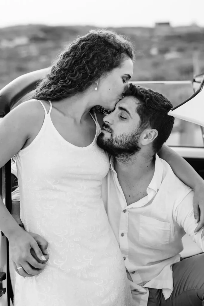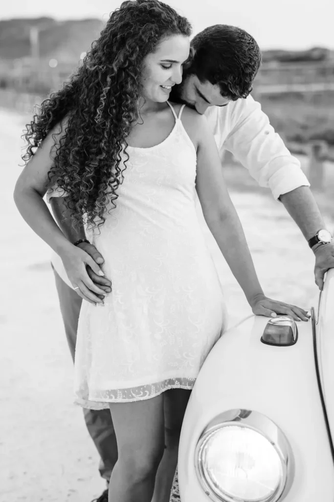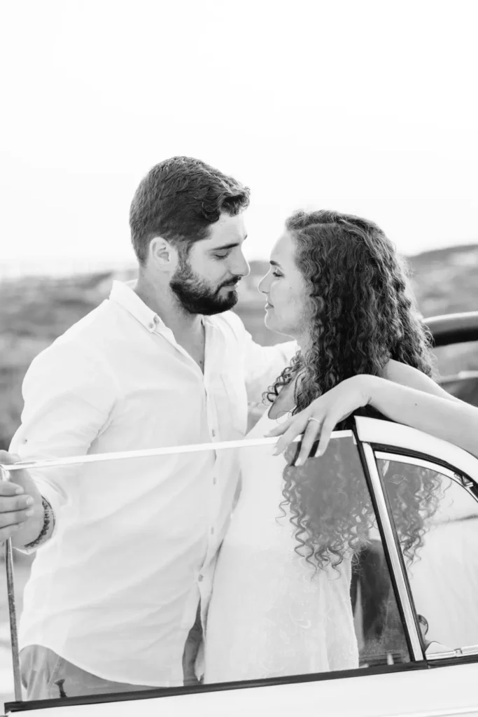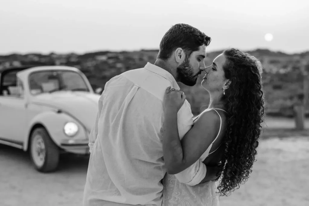 Mas as surpresas da Sónia e do Cristiano não se ficaram pelos cavalos. Para terminar esta sessão de forma memorável, os noivos levaram consigo um antigo Volkswagen Carocha. Usámos este clássico intemporal como cenário de fundo para os últimos retratos do dia. O contraste entre as linhas vintage do carro e o pôr do sol na praia deu o toque de magia final a uma tarde absolutamente perfeita!